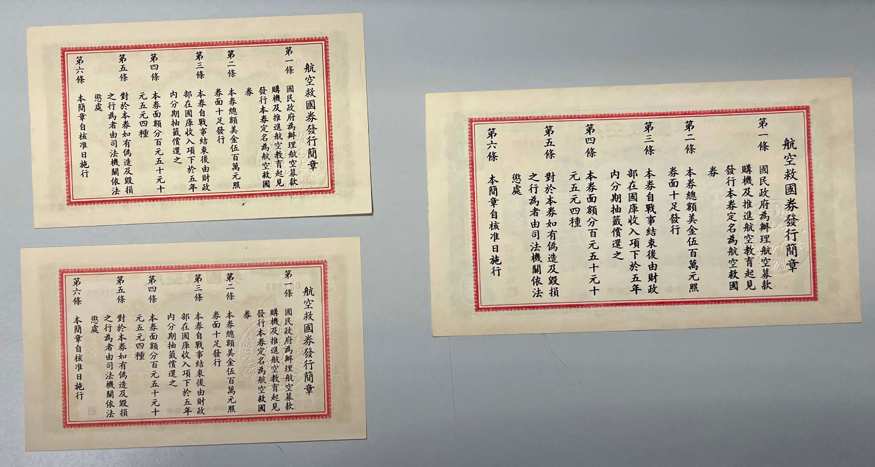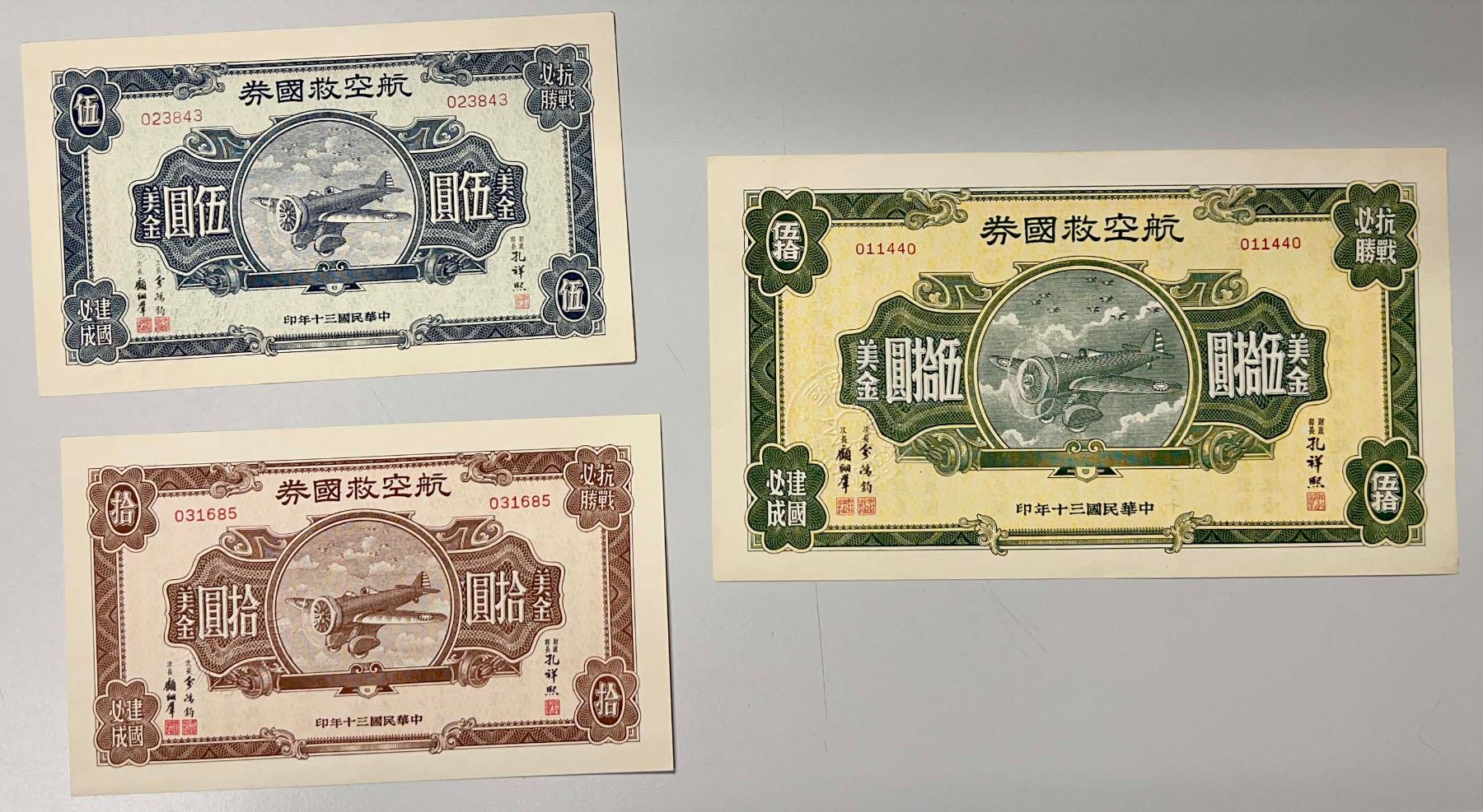 CHINA: Republic, SET of 3 bonds, year 30 (1941), Patriotic Aviation series, including 5, 10, and 50 dollars, all UNC and without creases or damages, set of 3 bonds. China issued Patriotic Aviation Bonds in 1941 to raise funds for new aircraft during the Second Sino-Japanese War.These bonds were issued in denominations of $5, $10, $50, and $100, likely targeting overseas Chinese. The bonds featured a Boeing P-26 aircraft, honoring the Chinese Air Force. The goal was to raise $50,000,000 to purchase new planes, although they only received eleven aircraft.