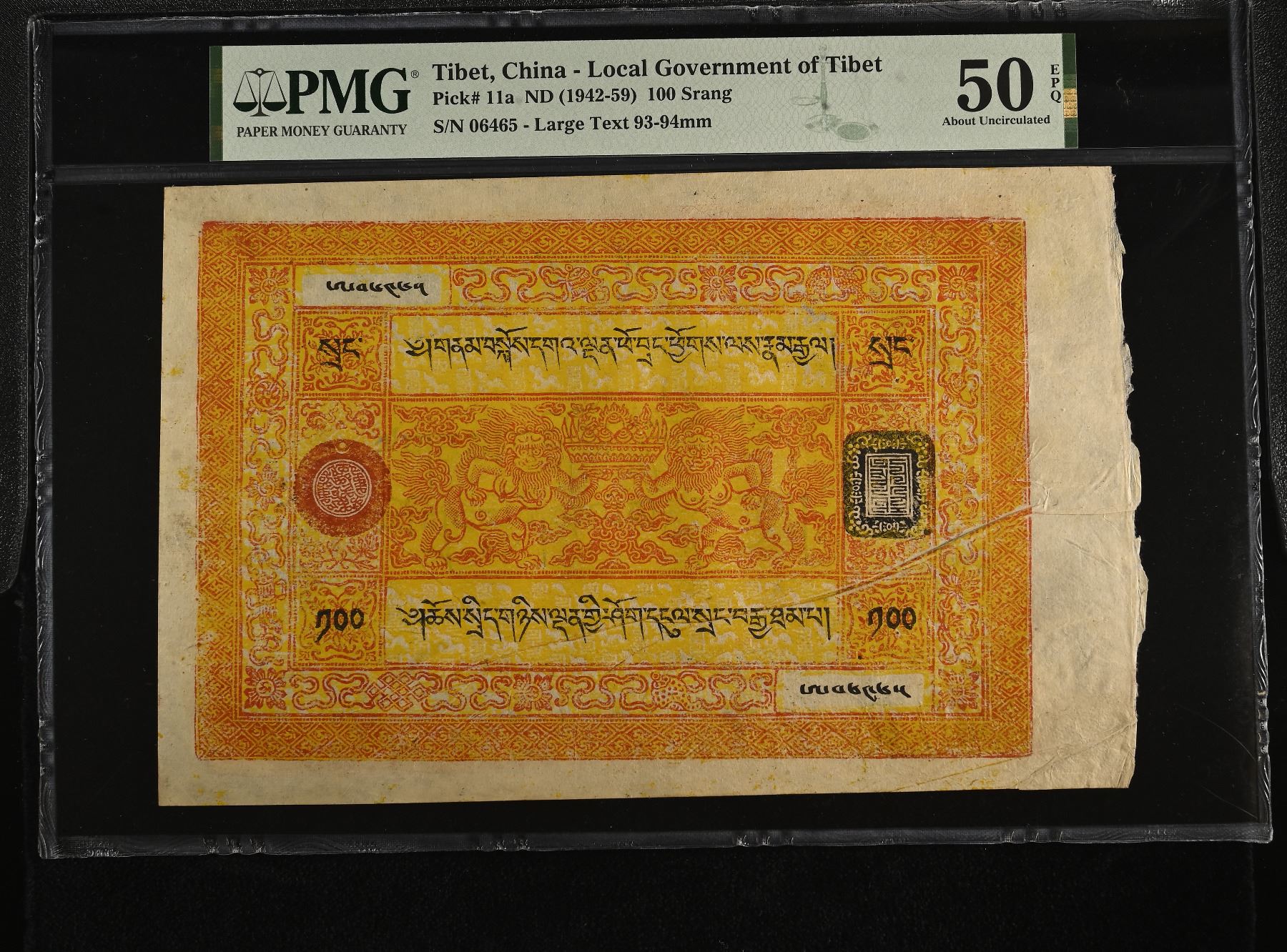 CHINA: TIBET: Autonomous Tibetan Issue, 100 srang, ND (1942-59), Pick-11a, 135x211mm note, variety with large text, orange on yellow underprint, two lions with fruit bowl at center, red and black validation seals, serial number 06465, PMG graded AU50 EPQ, ex George Anderson Collection; ex Stacks, Bowers & Ponterio April 2017 Hong Kong Auction, Lot 70639 (part); ex Sir Alexander B. Lissanevitch Collection. Part of a group of 25 notes that have consecutive serial numbers. They were bought in Hong Kong as a single lot in the Stack's sale.