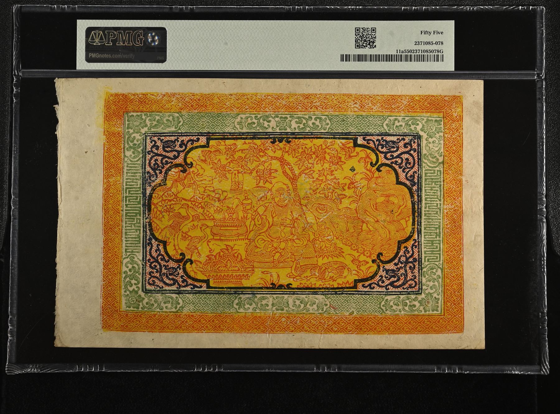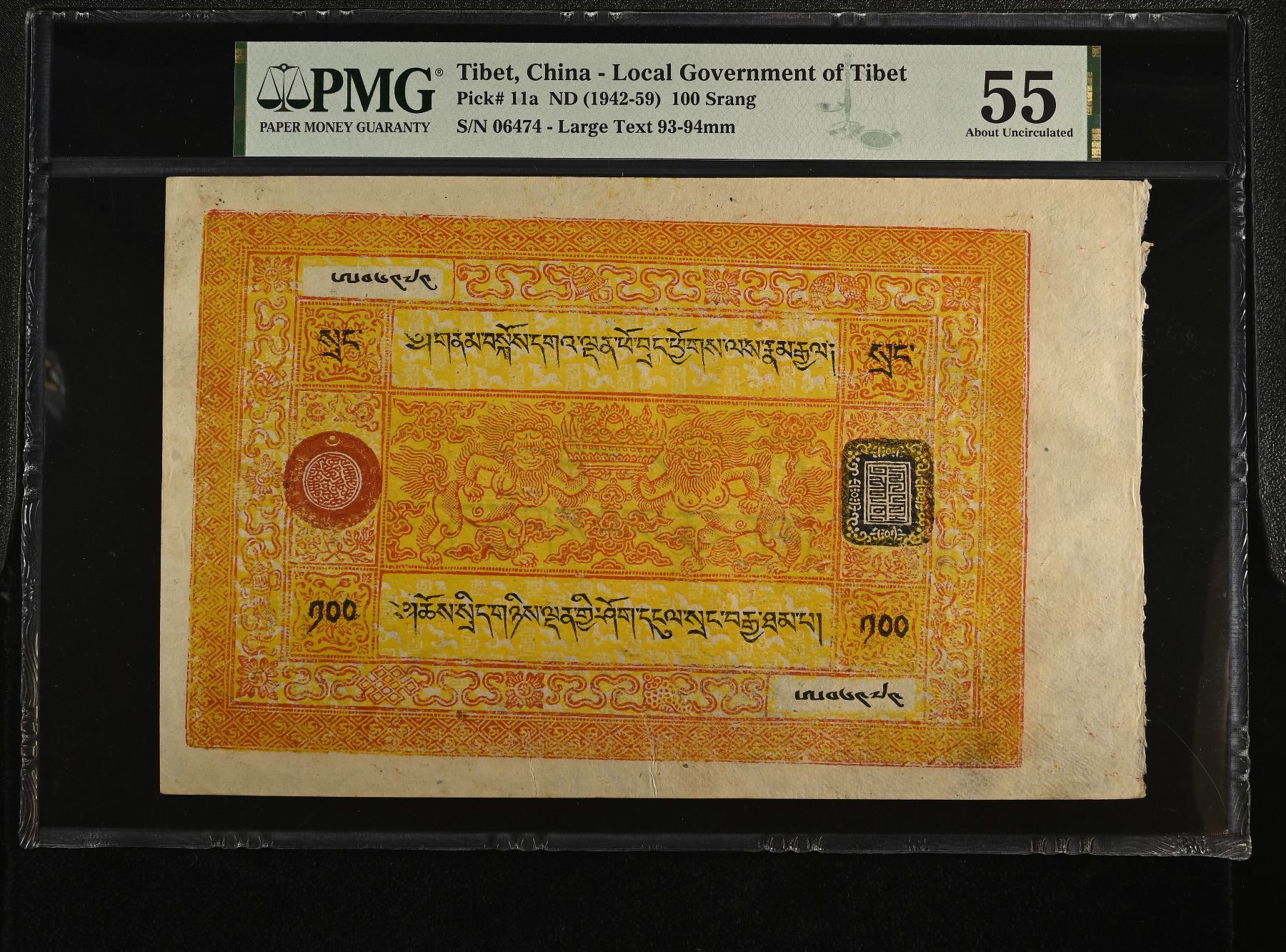 CHINA: TIBET: Autonomous Tibetan Issue, 100 srang, ND (1942-59), Pick-11a, 135x213mm note, variety with large text, orange on yellow underprint, two lions with fruit bowl at center, red and black validation seals, serial number 06474, PMG graded AU55, ex George Anderson Collection; ex Stacks, Bowers & Ponterio April 2017 Hong Kong Auction, Lot 70639 (part); ex Sir Alexander B. Lissanevitch Collection. Part of a group of 25 notes that have consecutive serial numbers. They were bought in Hong Kong as a single lot in the Stack's sale.