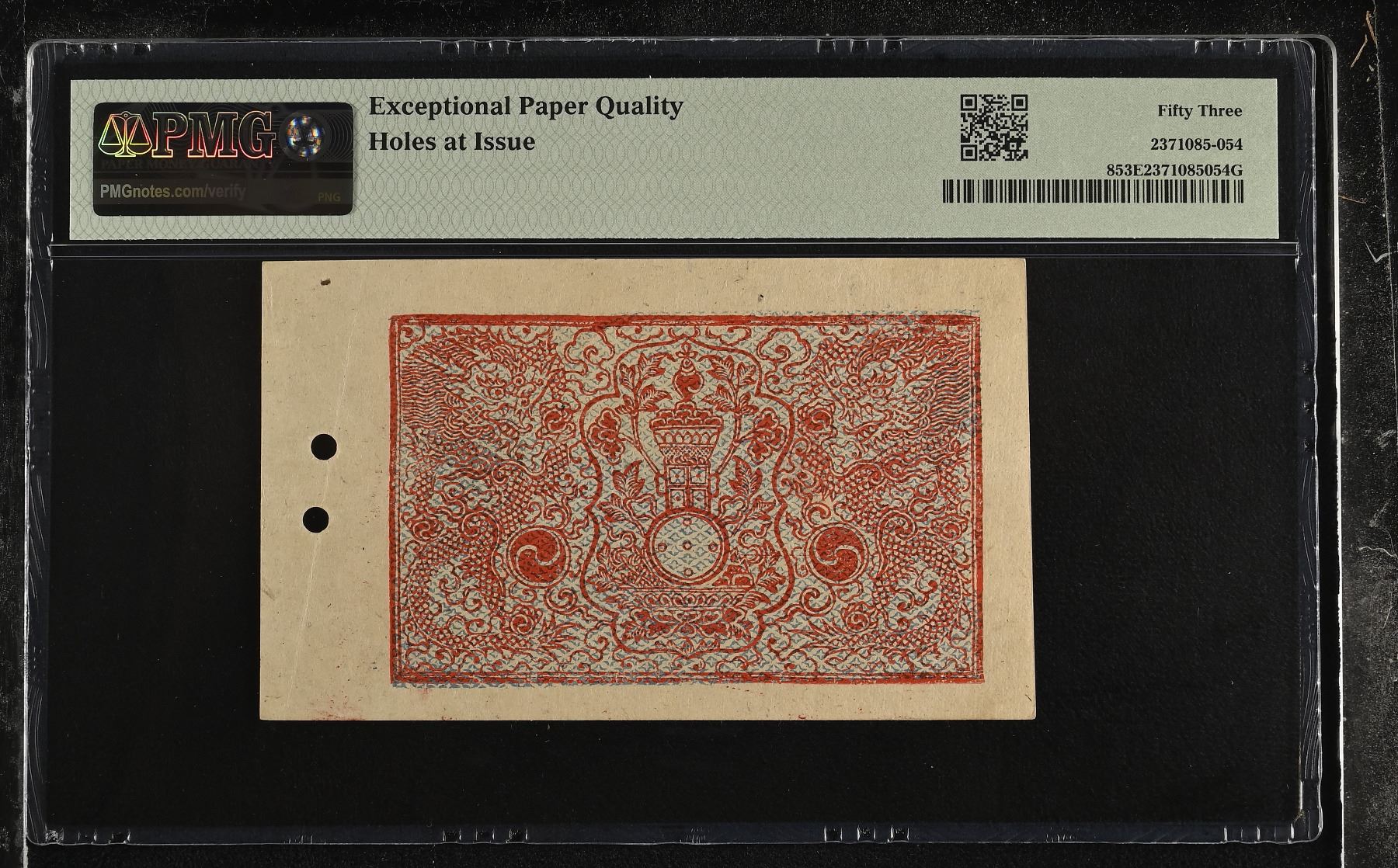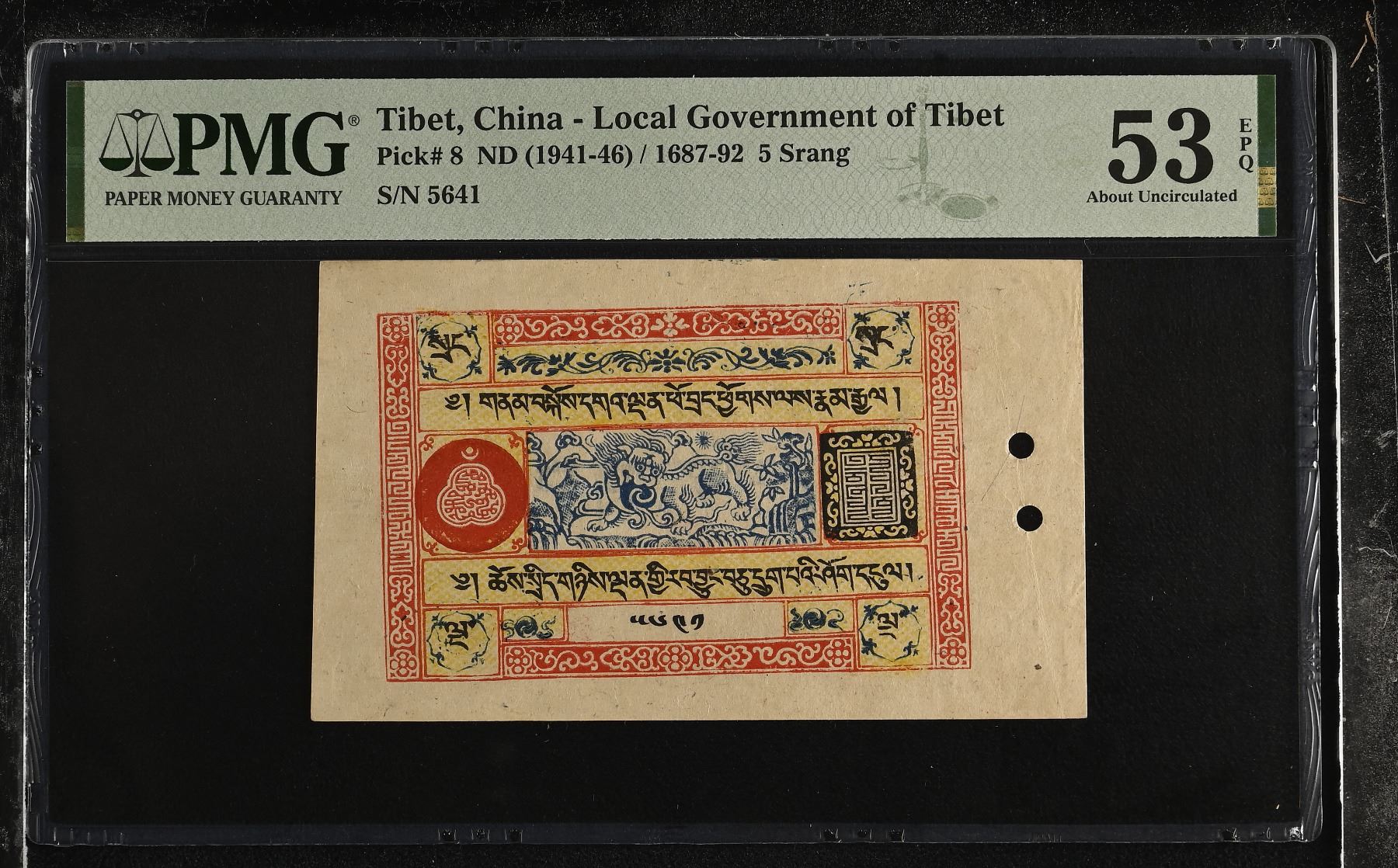CHINA: TIBET: Autonomous Tibetan Issue, 5 srang, ND (1942-46), Pick-8, 72x121mm note, blue, pink, yellow, and black on buff paper, red and black validation seals, Holes in Right Margin at Issue, PMG graded AU53 EPQ, ex George Anderson Collection, ex Sir Alexander B. Lissanevitch Collection.