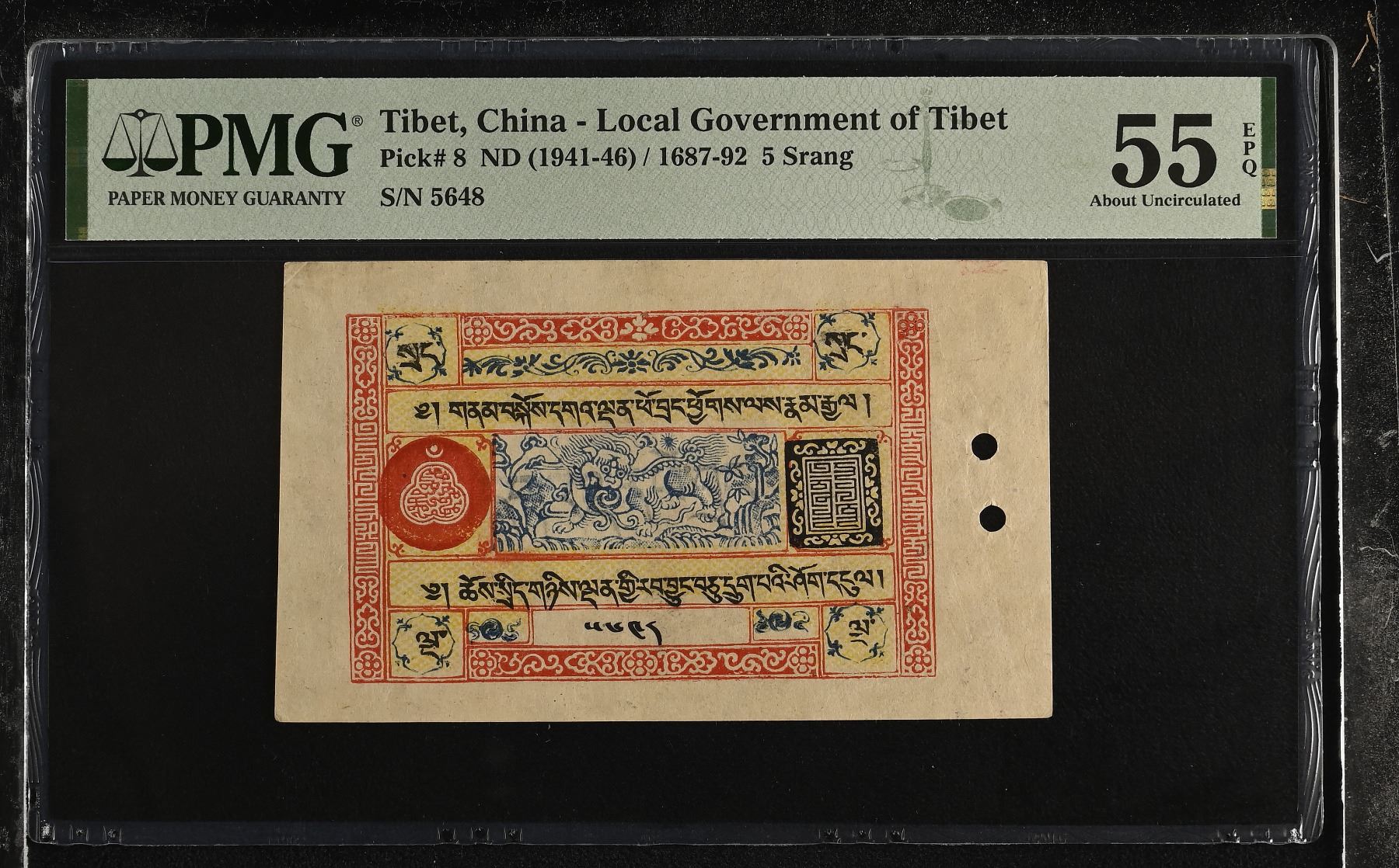 CHINA: TIBET: Autonomous Tibetan Issue, 5 srang, ND (1942-46), Pick-8, 72x121mm note, blue, pink, yellow, and black on buff paper, red and black validation seals, Holes in Right Margin at Issue, PMG graded AU55 EPQ, ex George Anderson Collection, ex Sir Alexander B. Lissanevitch Collection.