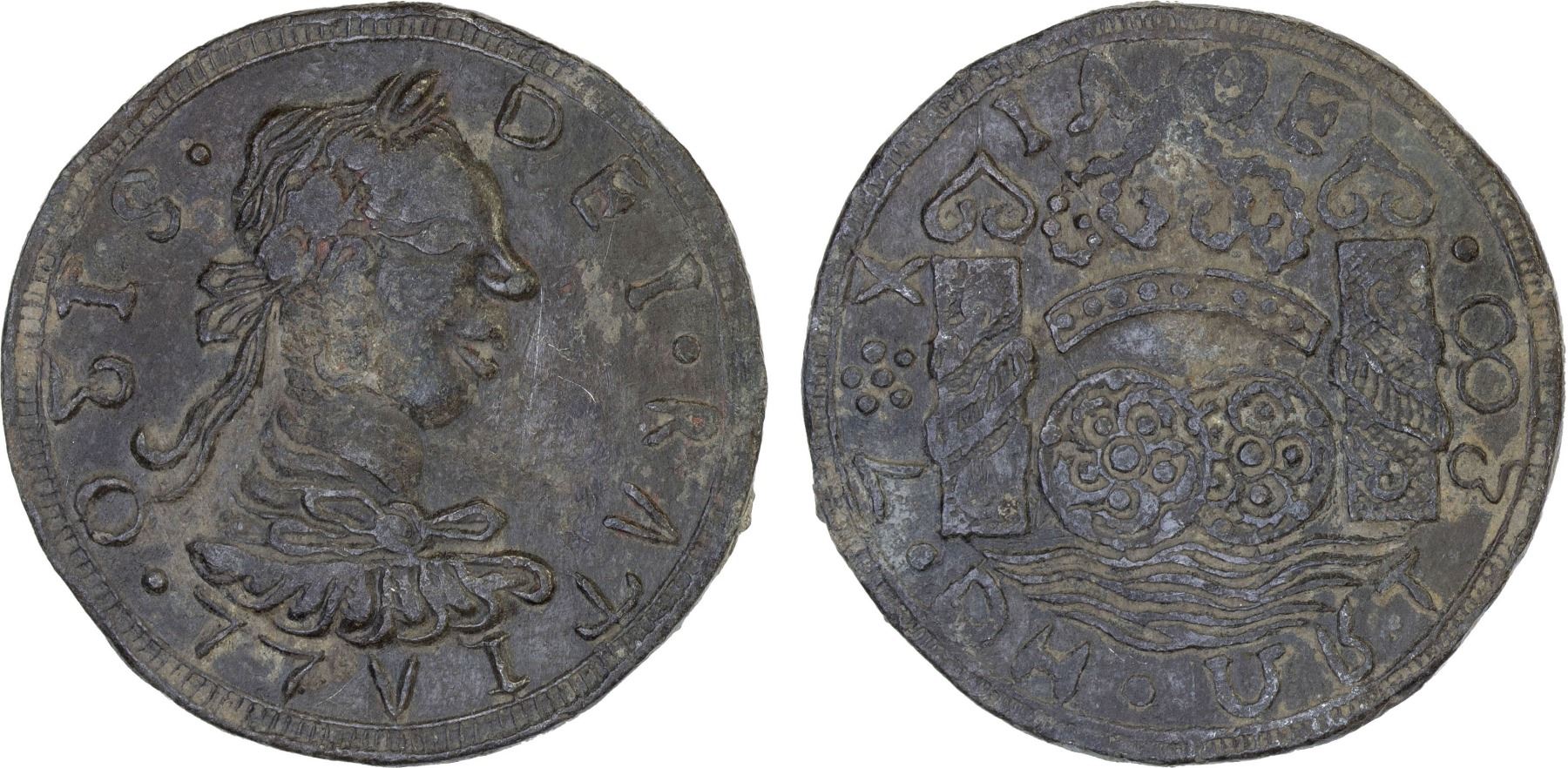 CHINA: tin burial token (13.29g), made with tin-lead alloy, crudely copying a Spanish 8 reales, with a nameless bust on one side and the globe design of the Pillar Dollar on the other side, used as mortuary currency (or "hell money") in Jiangsu according to the consignor, XF. This is one of the first pieces of Western-style Chinese mortuary currency that we have ever encountered.