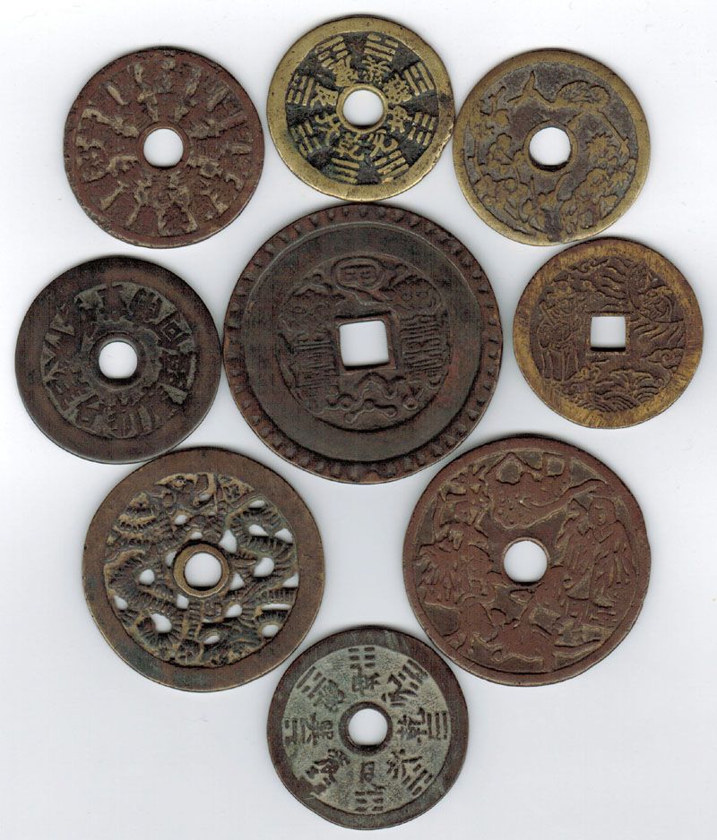 CHINA:COLLECTION of 9 pieces of Qing dynasty and early Min Guo period; including (1) with old man turtle crane etc. (2) with trigams (1) open-work dragon charm (1) with crane (1) with person with animal within sun (2) miscellaneous (1) interesting unidentified religious charm with two scrolls wriiten in seal script, lot of 9 items.