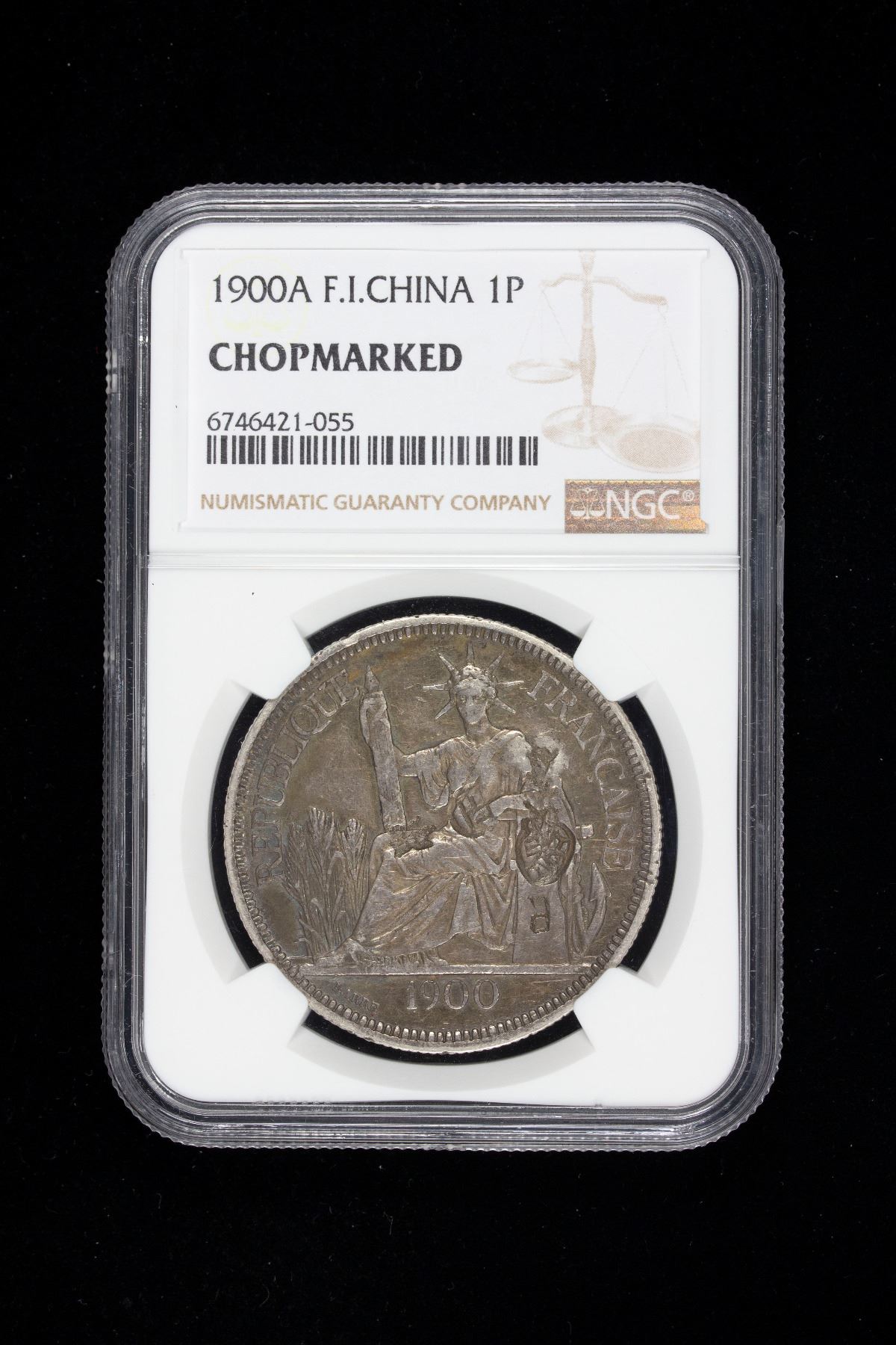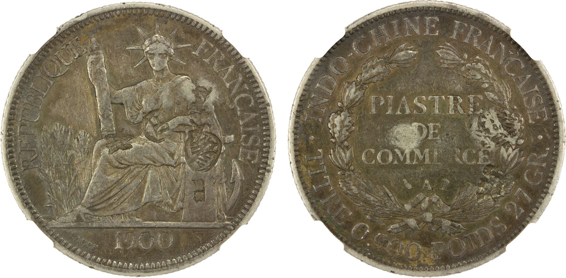 CHINESE CHOPMARKS: FRENCH INDOCHINA: AR piastre, 1900-A, KM-5a.1, Paris Mint, Chinese merchant chopmarks, in an NGC Chopmarked holder with no grade.