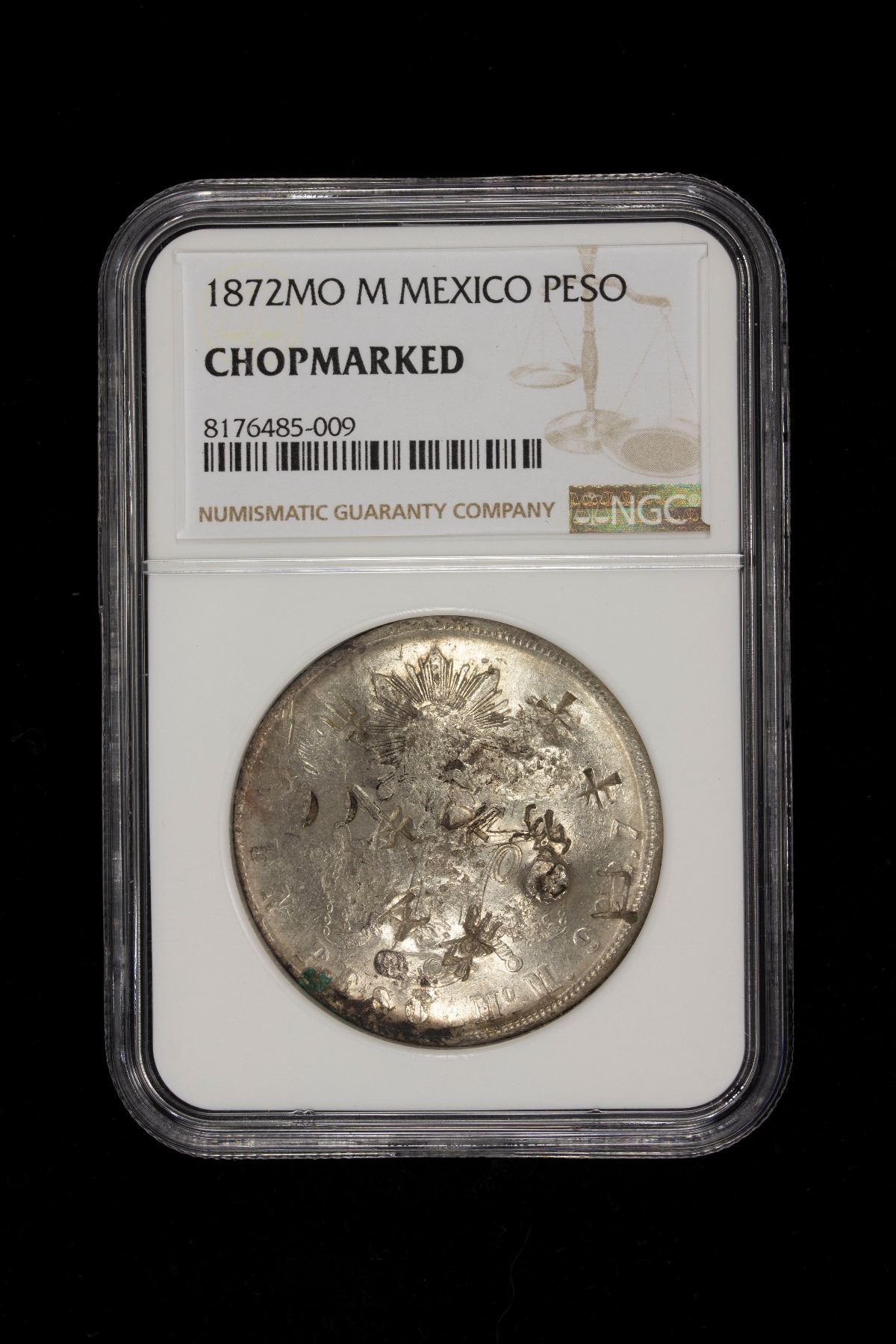 CHINESE CHOPMARKS: MEXICO: Republic, AR peso, 1872-Mo, KM-408.5, assayer M, Balance Scale type, host scyphate with several large Chinese merchant chopmarks and testmarks, NGC graded XF details.