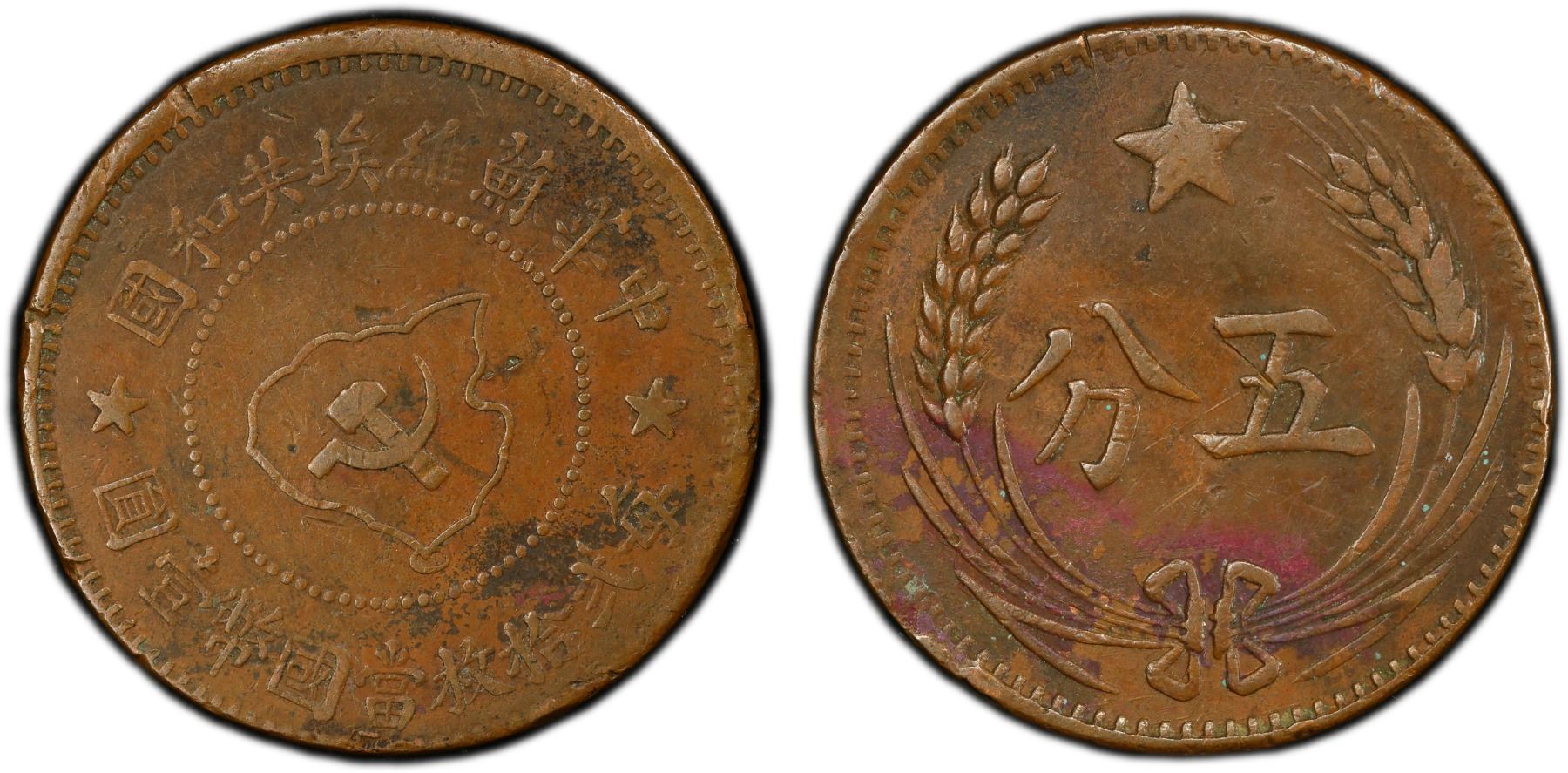 CHINESE SOVIET REPUBLIC: AE 5 cents, ND (1932), Y-507.1, CL-SWA.03/04, original strike issue of the Kiangsi Soviet, variety with connected island and plain edge, a couple rim bumps, PCGS graded XF details. The Chinese Soviet Republic is often referred to in historical sources as the Jiangxi Soviet (after its largest component territory, the Jiangxi-Fujian Soviet). It was established in November 1931 by future Communist Party of China leader Mao Zedong, General Zhu De and others, and it lasted until 1937.