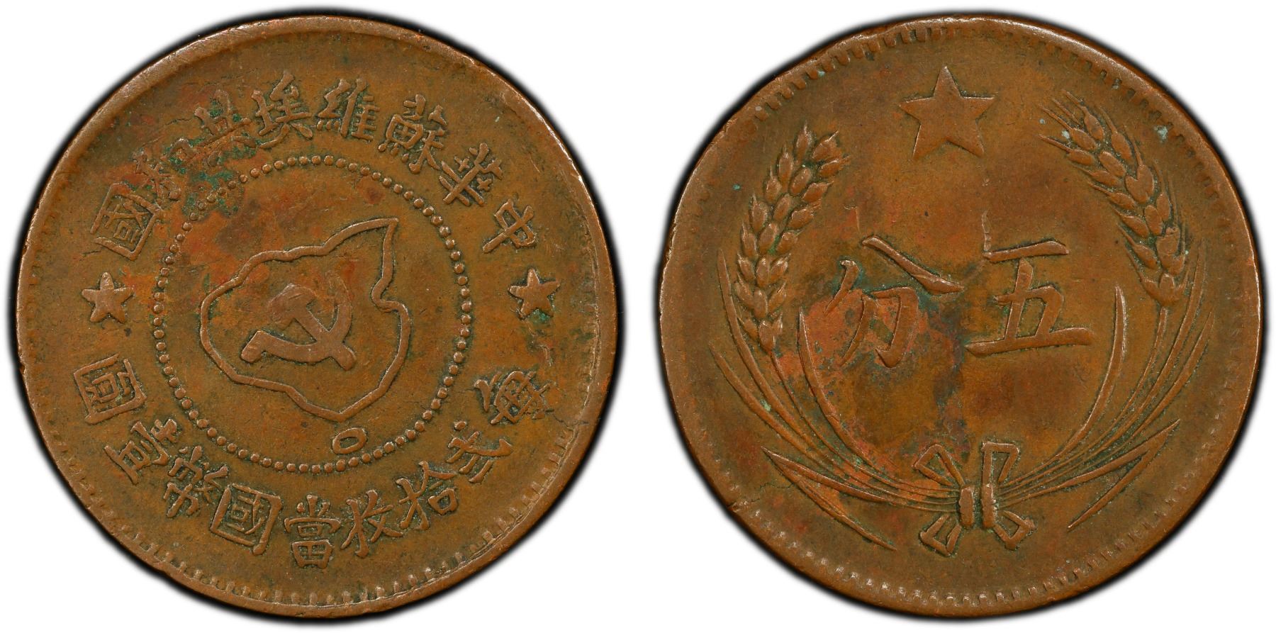 CHINESE SOVIET REPUBLIC: AE 5 cents, ND (1932), Y-507.1, CL-SWA.03/04, original strike issue of the Kiangsi Soviet, variety with disconnected island and plain edge, some staining in the fields, PCGS graded XF details. The Chinese Soviet Republic is often referred to in historical sources as the Jiangxi Soviet (after its largest component territory, the Jiangxi-Fujian Soviet). It was established in November 1931 by future Communist Party of China leader Mao Zedong, General Zhu De and others, and it lasted until 1937.