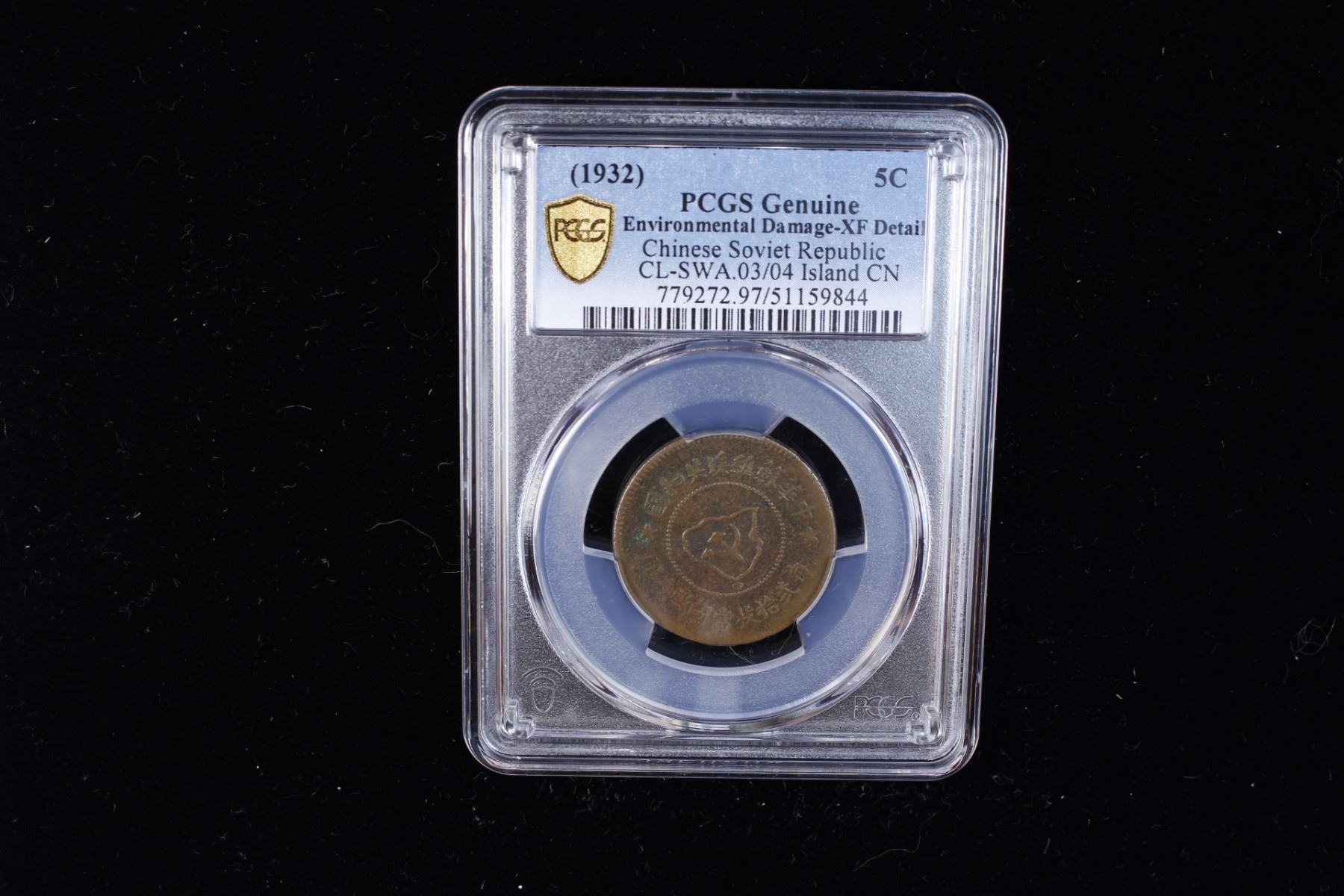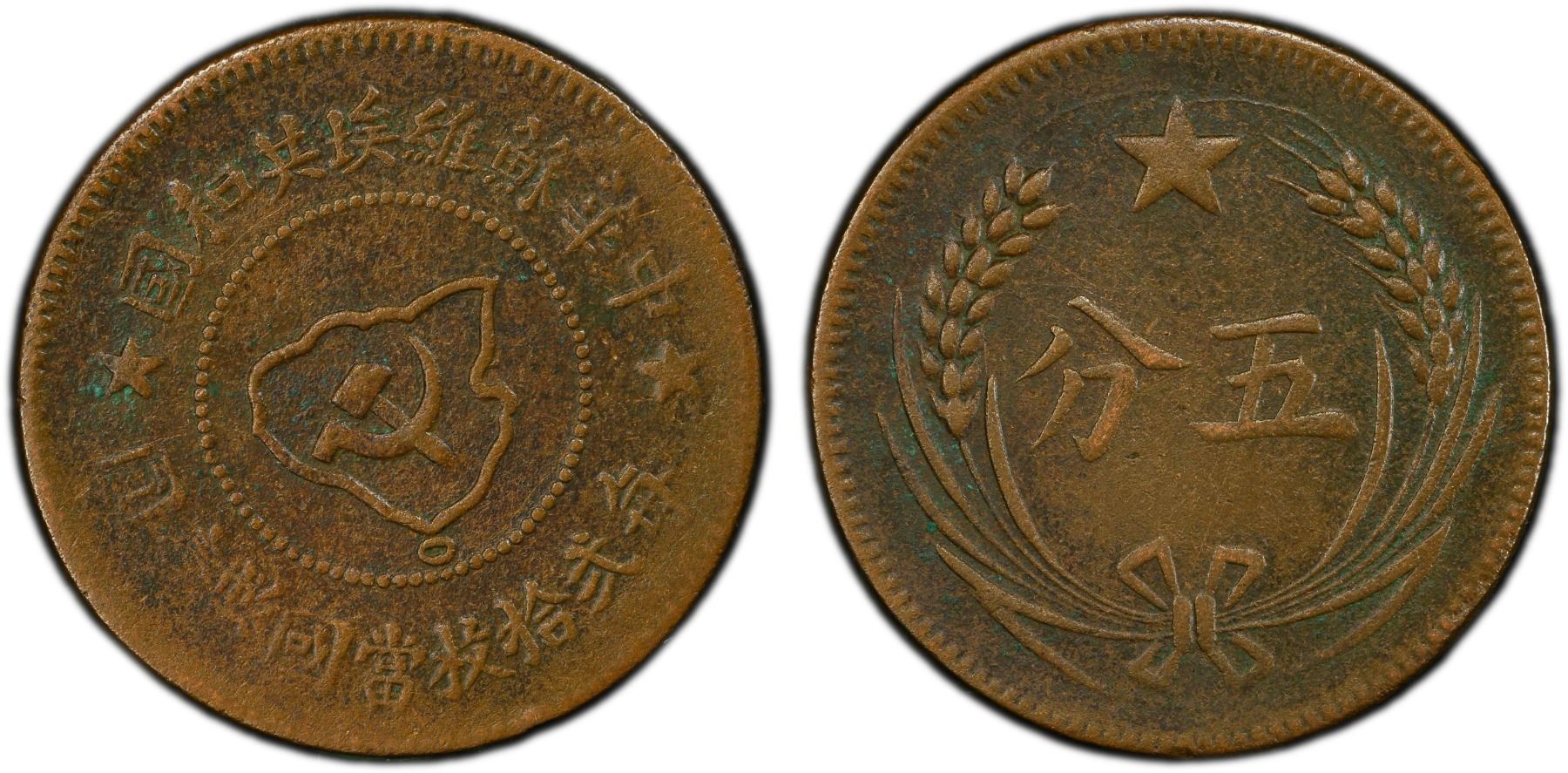 CHINESE SOVIET REPUBLIC: AE 5 cents, ND (1932), Y-507.1, CL-SWA.03/04, original strike issue of the Kiangsi Soviet, variety with disconnected island and plain edge, slightly porous fields, PCGS graded XF details. The Chinese Soviet Republic is often referred to in historical sources as the Jiangxi Soviet (after its largest component territory, the Jiangxi-Fujian Soviet). It was established in November 1931 by future Communist Party of China leader Mao Zedong, General Zhu De and others, and it lasted until 1937.
