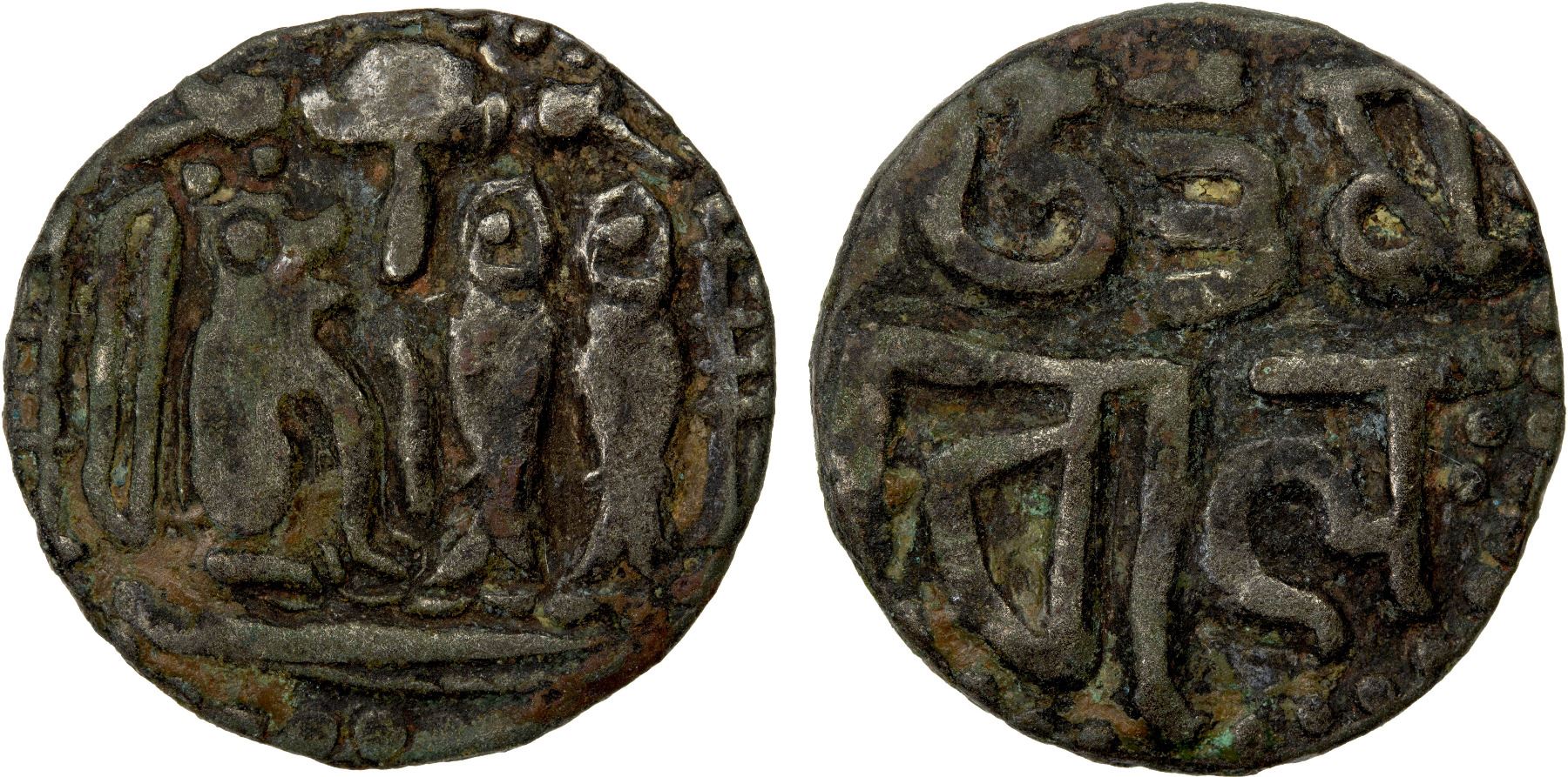 CHOLAS OF TANJORE: Uttama Chola, 973-985, AR kahavanu (4.29g), Mitch-SI2-323-329, tiger seated right, facing 2 fish upright, bow behind, between two standards, parasol above // Nagari legend uttama / cholah, VF.