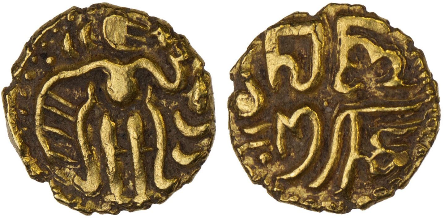 CHOLAS: temp. Raja Raja I, 985-1014, AV 1/6 kahavanu (0.71g), Mitch-, Zeno-140475, Ganesh p.7, #1.8, king standing, head turned right, holding uncertain object above // Nagari legend uma / konda, conch shell above, VF-XF, RR. Almost all known examples weight in range of 0.70g to 0.72g, which corresponds to 1/6 kahavanu, not 1/8 kahavanu as published by Zeno and coin dealers.