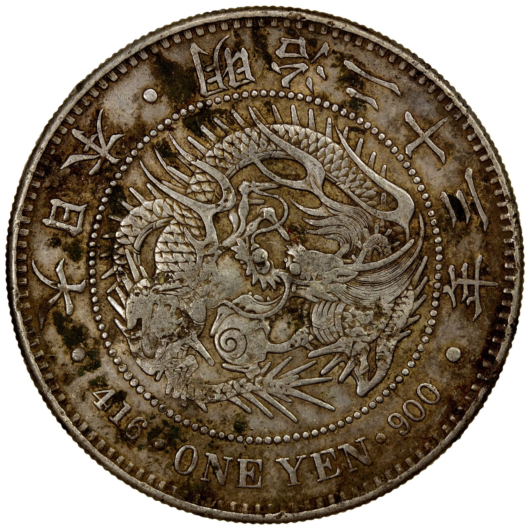 CHOPMARKED COINS: JAPAN: Meiji, 1868-1912, AR yen, year 23 (1890), Y-A25.3, JNDA-01-10A, with several large Chinese merchant chopmarks, VF.