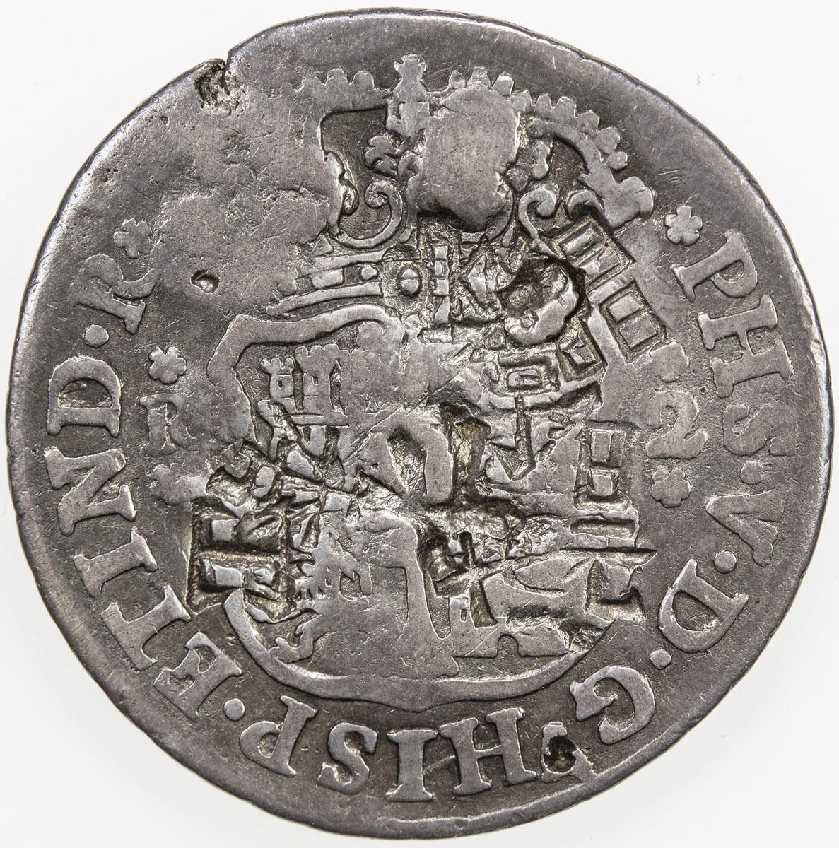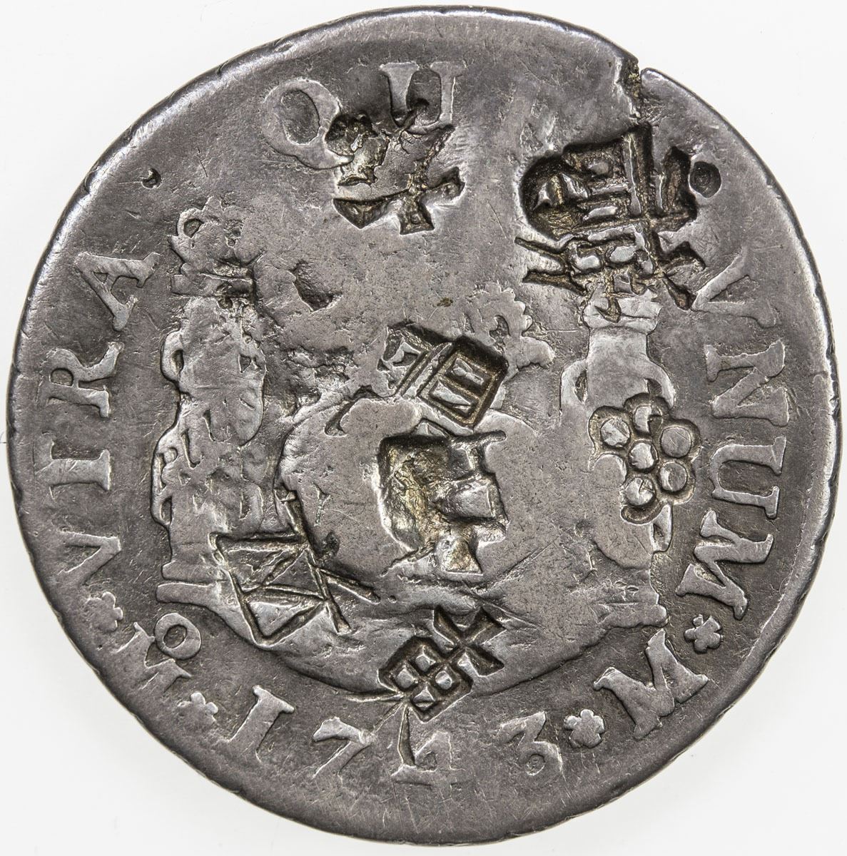 CHOPMARKED COINS: MEXICO: Felipe V, 1700-1746, AR 2 reales, 1743-Mo, KM-85, assayer M, 'pillar dollar ' or 'columnario ' type, many large Chinese merchant chopmarks, Fine, ex D. R. Bain Collection.