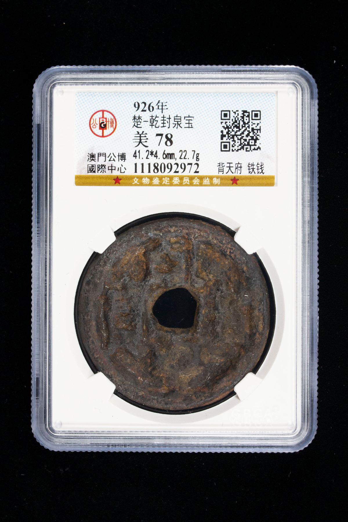 CHU: Qian Feng, 925-951, iron 10 cash (22.7g), H-15.65, qian feng quan bao, with tian fu on reverse, graded 78 by GBCA Grading Company, Fine, ex Dr. Dirk Löer Collection. According to the histories, because there was much lead and iron in Hunan, Ma Yin took the advice of his minister Gao Yu to cast lead and iron coins at Changsha in 925. One of these was worth ten copper cash, and their circulation was confined to Changsha. Merchants traded in these coins, to the benefit of the State.