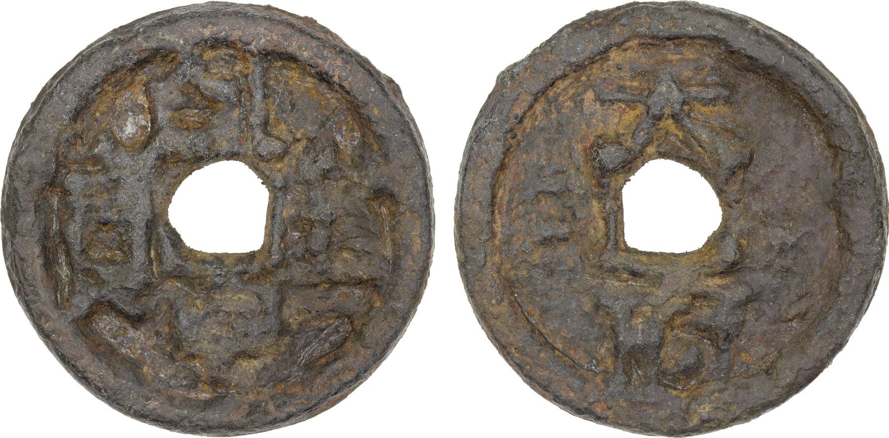 CHU: Qian Feng, 925-951, iron 10 cash (22.7g), H-15.65, qian feng quan bao, with tian fu on reverse, graded 78 by GBCA Grading Company, Fine, ex Dr. Dirk Löer Collection. According to the histories, because there was much lead and iron in Hunan, Ma Yin took the advice of his minister Gao Yu to cast lead and iron coins at Changsha in 925. One of these was worth ten copper cash, and their circulation was confined to Changsha. Merchants traded in these coins, to the benefit of the State.