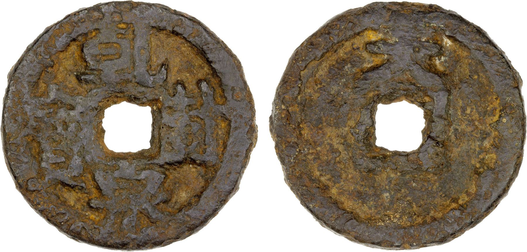 CHU: Qian Feng, 925-951, iron 10 cash (24.77g), H-15.62, qian feng quán bao, with tian above on reverse, VF. According to the histories, because there was much lead and iron in Hunan, Ma Yin took the advice of his minister Gao Yu to cast lead and iron coins at Changsha in 925. One of these was worth ten copper cash, and their circulation was confined to Changsha. Merchants traded in these coins, to the benefit of the State.