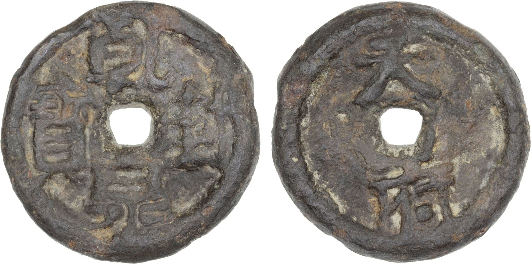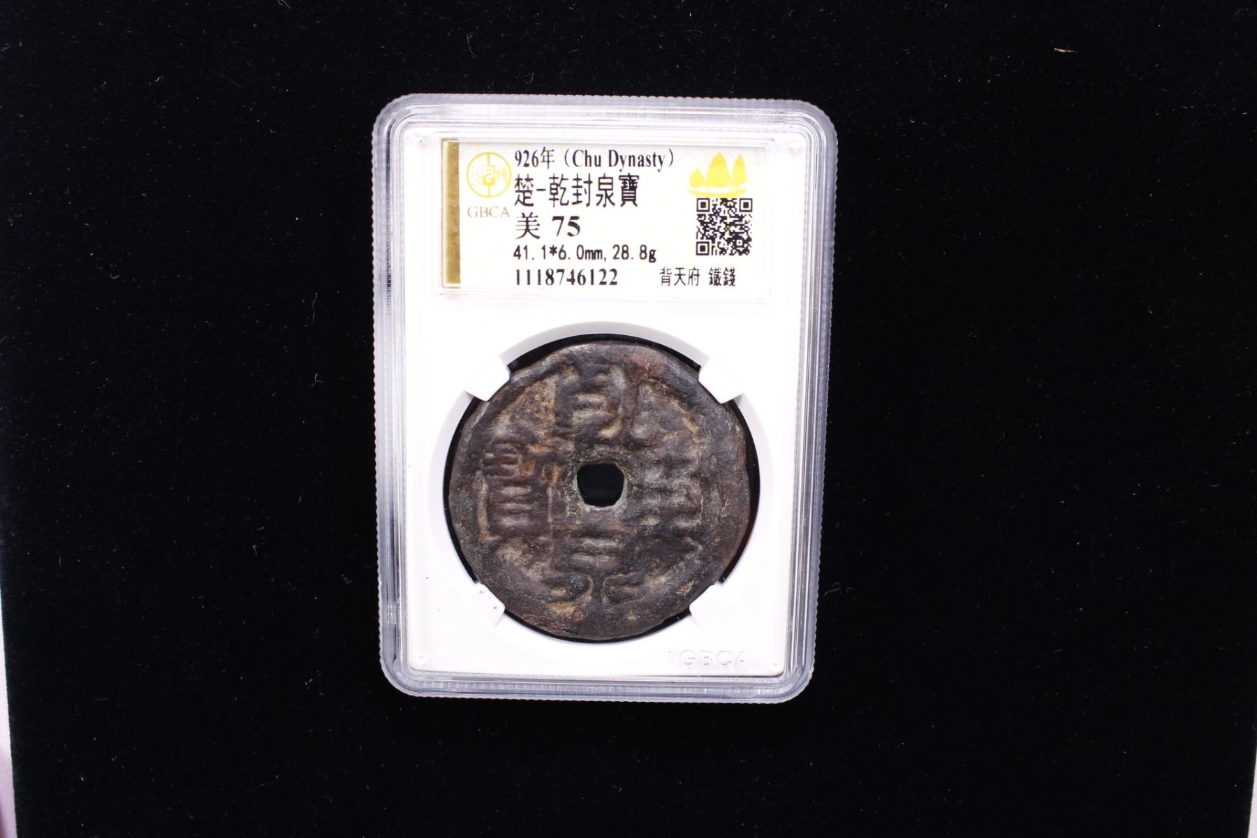 CHU: Qian Feng, 925-951, iron 10 cash (28.8g), H-15.65, qian feng quán bao, with tian fu above on reverse, graded 75 by GBCA Grading Company, F-VF, ex Dr. Dirk Löer Collection. According to the histories, because there was much lead and iron in Hunan, Ma Yin took the advice of his minister Gao Yu to cast lead and iron coins at Changsha in 925. One of these was worth ten copper cash, and their circulation was confined to Changsha. Merchants traded in these coins to the benefit of the State.