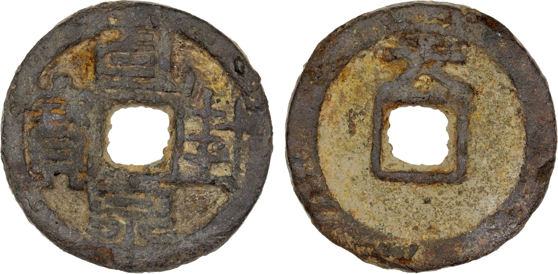 CHU: Qian Feng, 925-951, iron 10 cash (31.2g), H-15.62, qian feng quán bao, with tian above on reverse, graded 78 by GBCA Grading Company, VF, ex Dr. Dirk Löer Collection. According to the histories, because there was much lead and iron in Hunan, Ma Yin took the advice of his minister Gao Yu to cast lead and iron coins at Changsha in 925. One of these was worth ten copper cash, and their circulation was confined to Changsha. Merchants traded in these coins to the benefit of the State.