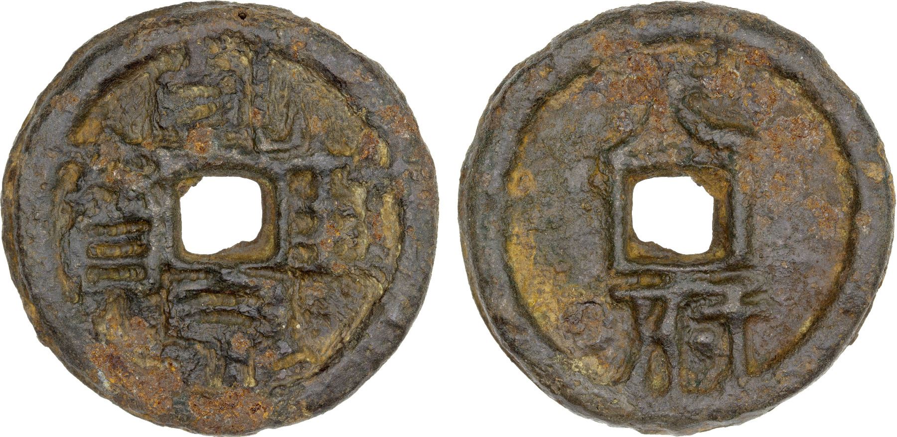 CHU: Qian Feng, 925-951, iron 10 cash (34.44g), H-15.65, qian feng quán bao, tian fu above on reverse, F-VF. According to the histories, because there was much lead and iron in Hunan, Ma Yin took the advice of his minister Gao Yu to cast lead and iron coins at Changsha in 925. One of these was worth ten copper cash, and their circulation was confined to Changsha. Merchants traded in these coins, to the benefit of the State.