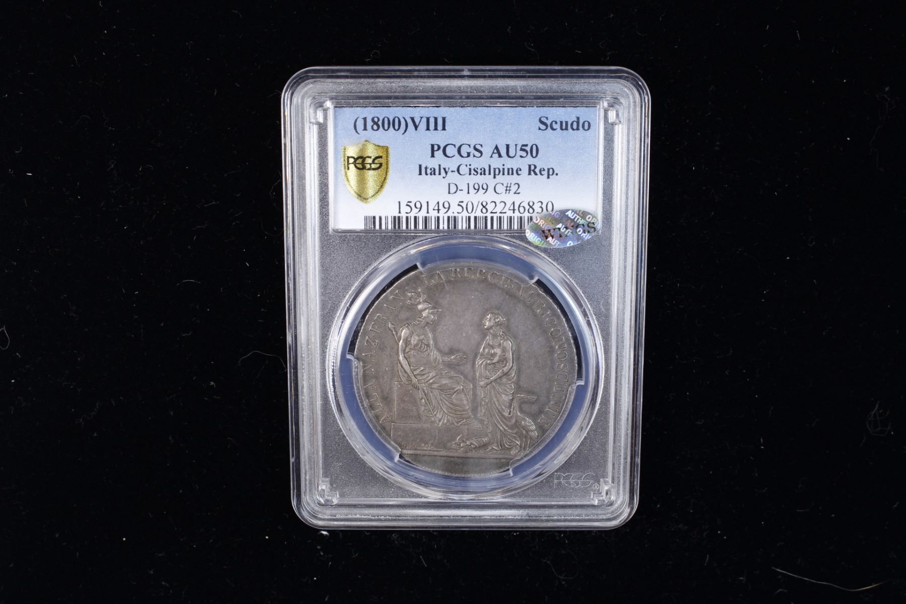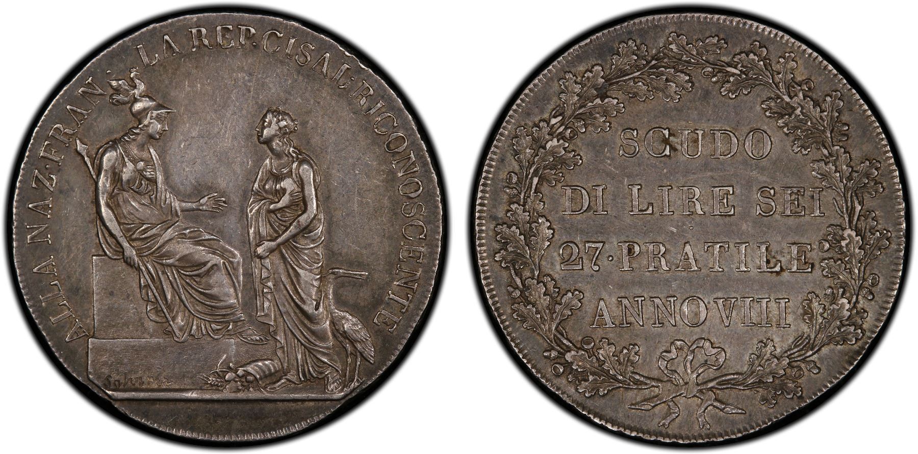 CISALPINE REPUBLIC: AR scudo, year VIII (1800), Cr-2, Dav-100, MIR-477, Pag-8, allegory of the Cisalpine Republic paying tribute to the seated France, with a stork on the right (symbol of devotion) and a cornucopia on the left (symbol of abundance), ALLA NAZ FRAN LA REP CISAL RICONOSCENTE // SCUDO / DI LIRE SEI / 27 PRATILE / ANNO VIII within oak wreath, attractive gray toning, PCGS graded AU50. WINGS.