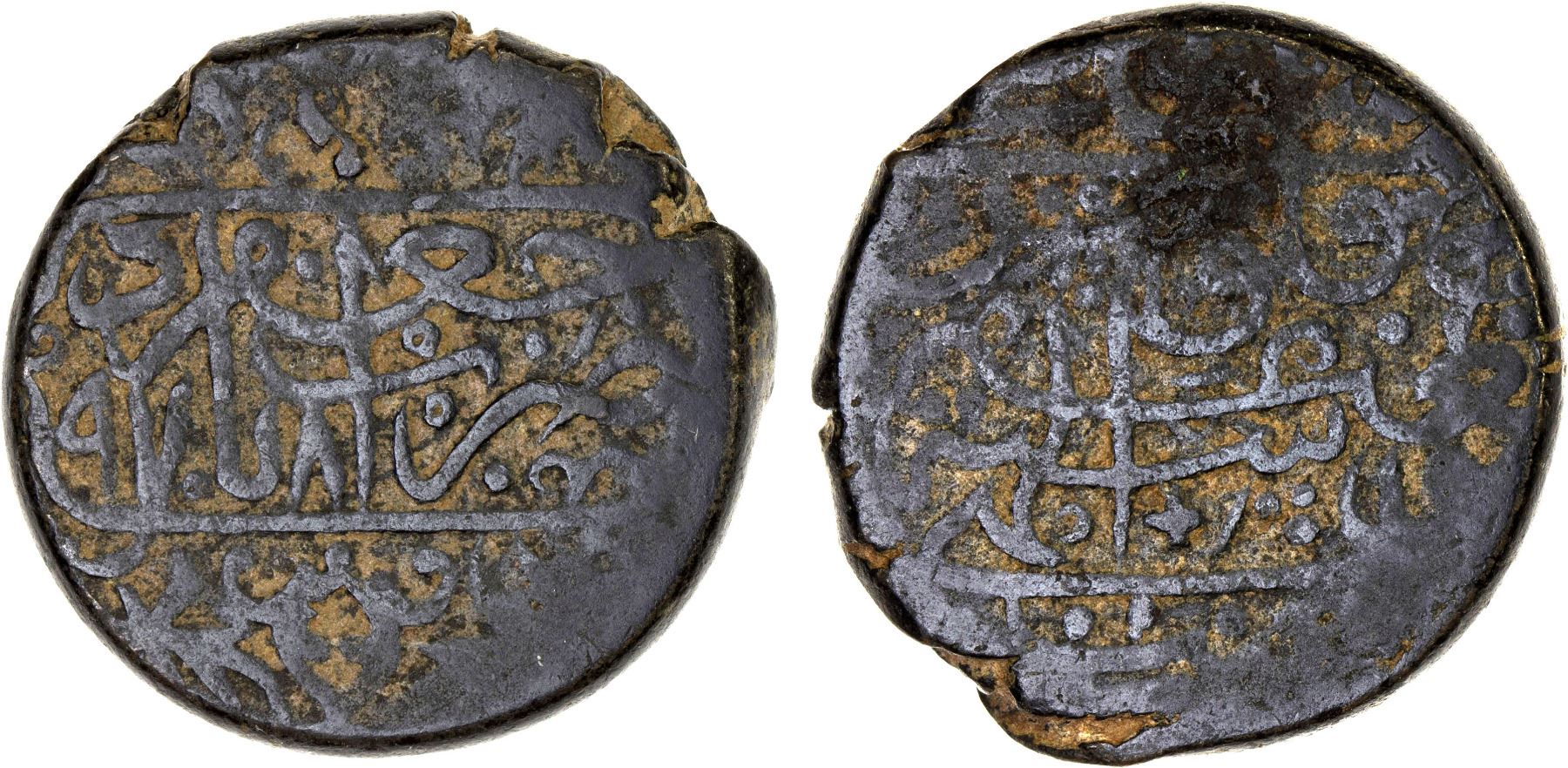 CIVIC COPPER: AE falus (11.51g), Ja'farabad, AH978, A-K3215.5, from the "La'nat" series, with short couplet peivasteh be-la'nat-e elahi taghyir deh(ad) folus-e shahi ("may he who alters the royal fulus be eternally [condemned] to the damnation of God"), unusually well struck, a rare and seldom offered type, VF, R, ex SARC Auction 24 Lot 659. Ja'farabad was a temporary administrative center near the city of Qazwin, active only in the late AH 900s.