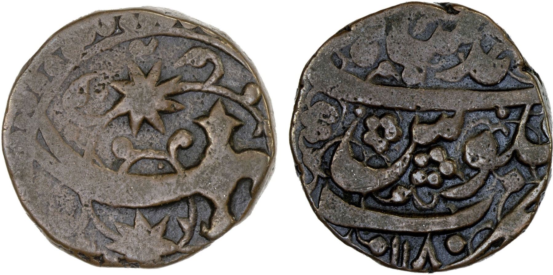 CIVIC COPPER: AE falus (12.09g), Ahmadshahi (Qandahar), AH118[0], A-3217, sword flanked by two stars // mintname above, date below, a lovely example with mint, date, and attractive brown patina, Choice VF.