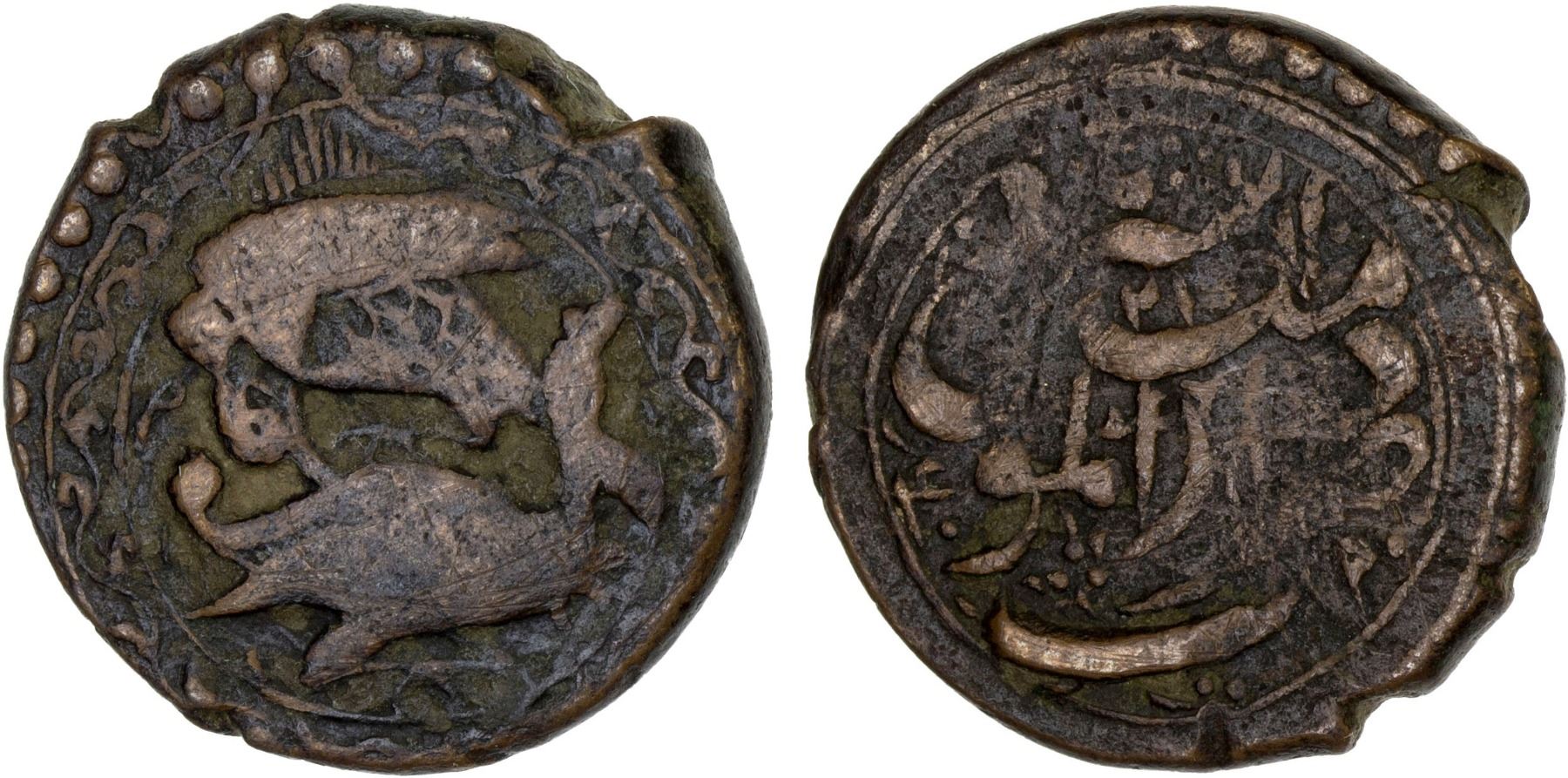 CIVIC COPPER: AE falus (6.81g), Astarabad, Dar al-Mu'minin, AH121x, A-3219, two uncertain animals, probably one attacking the other, VF.