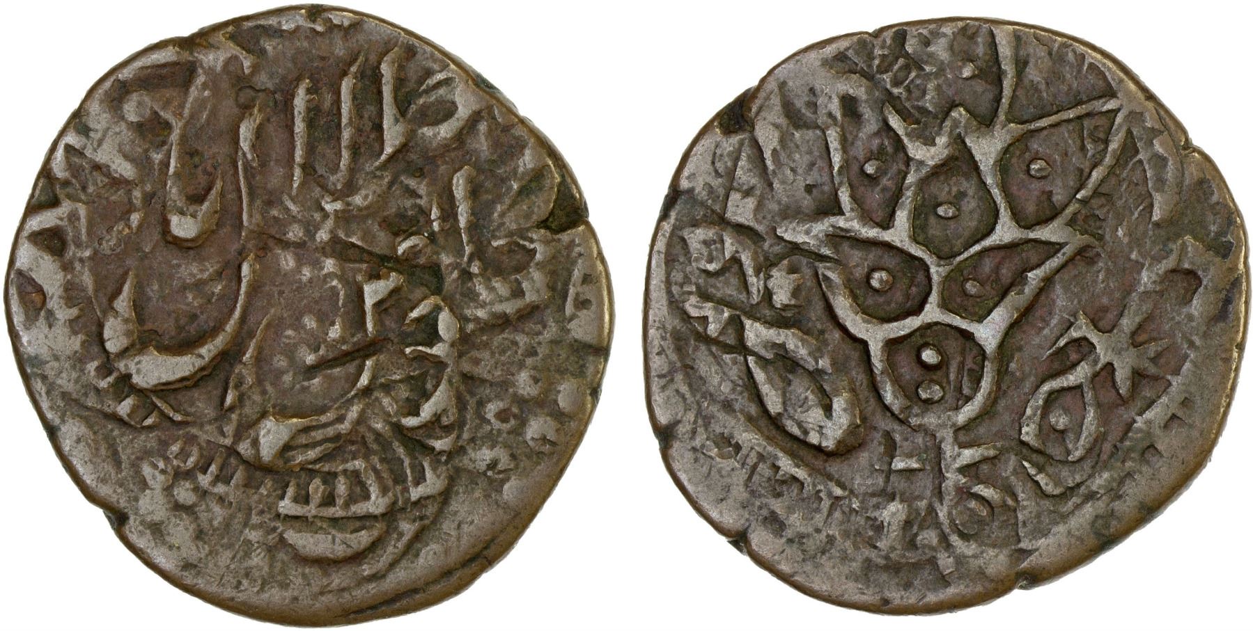 CIVIC COPPER: AE falus (8.11g), Jalalabad, ND, A-3238, large flower between two swords on reverse, accompanied by collector's information card, Choice VF, ex Anton Holt Collection.