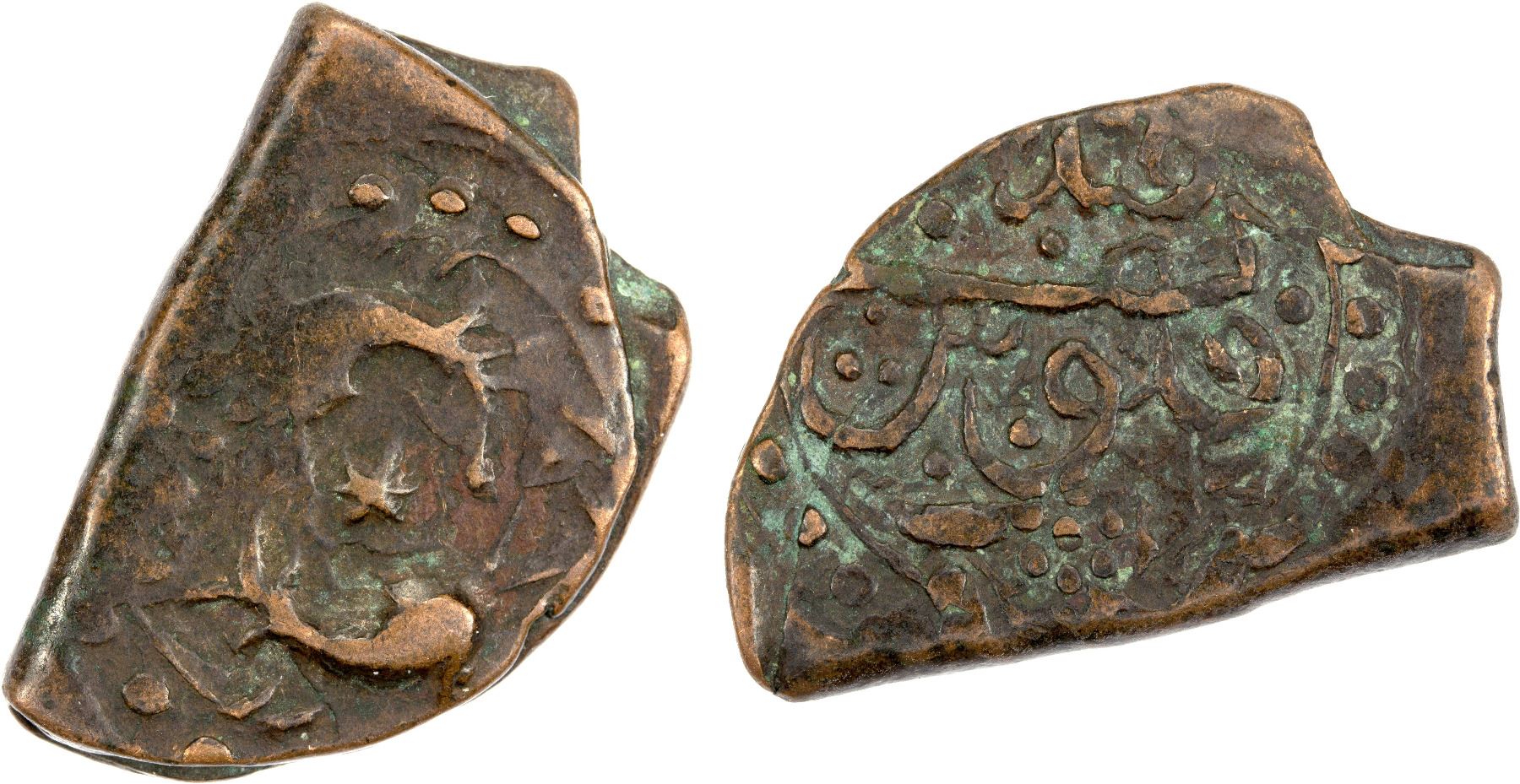 CIVIC COPPER: AE half round falus (8.17g), Qandahar, ND, A-3253, two fish swimming around star, struck on a folded over round flan, somewhat irregular shape, VF. The "half-round" type is much rarer than the square or rectangular types.