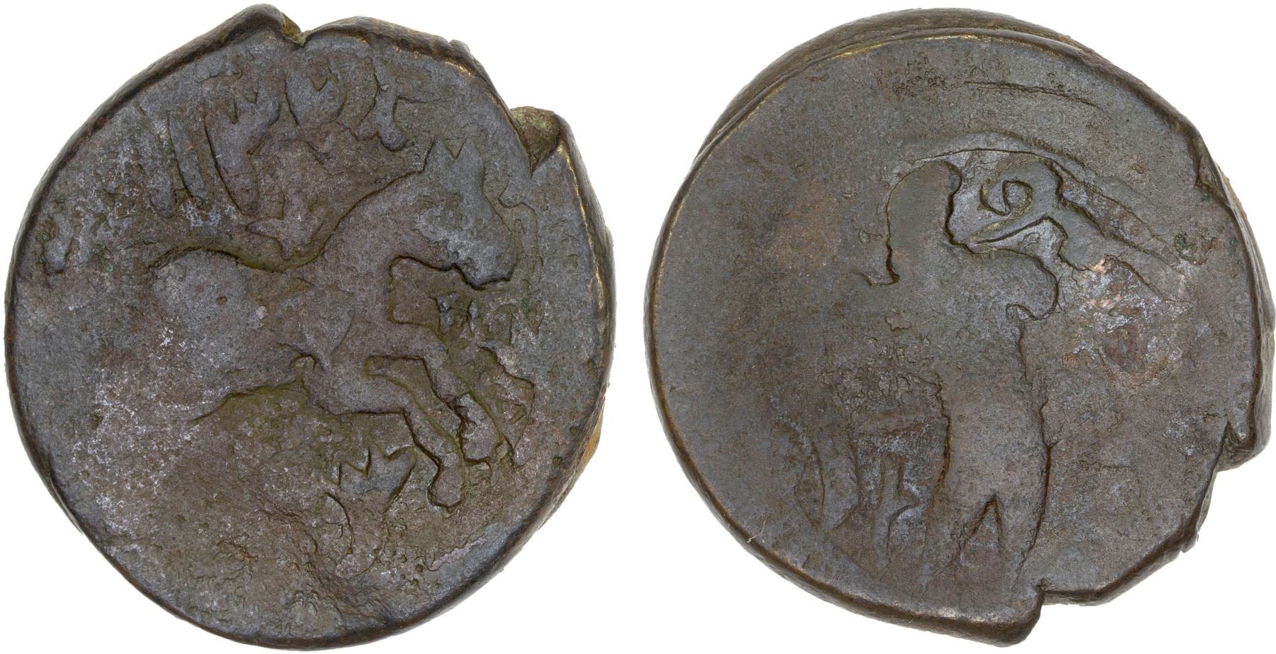 CIVIC COPPER: AFGHANISTAN: AE falus, Herat, AH1132, A-3235, SICA-IX:1628, horse galloping to right // 2-bladed sword, VG.