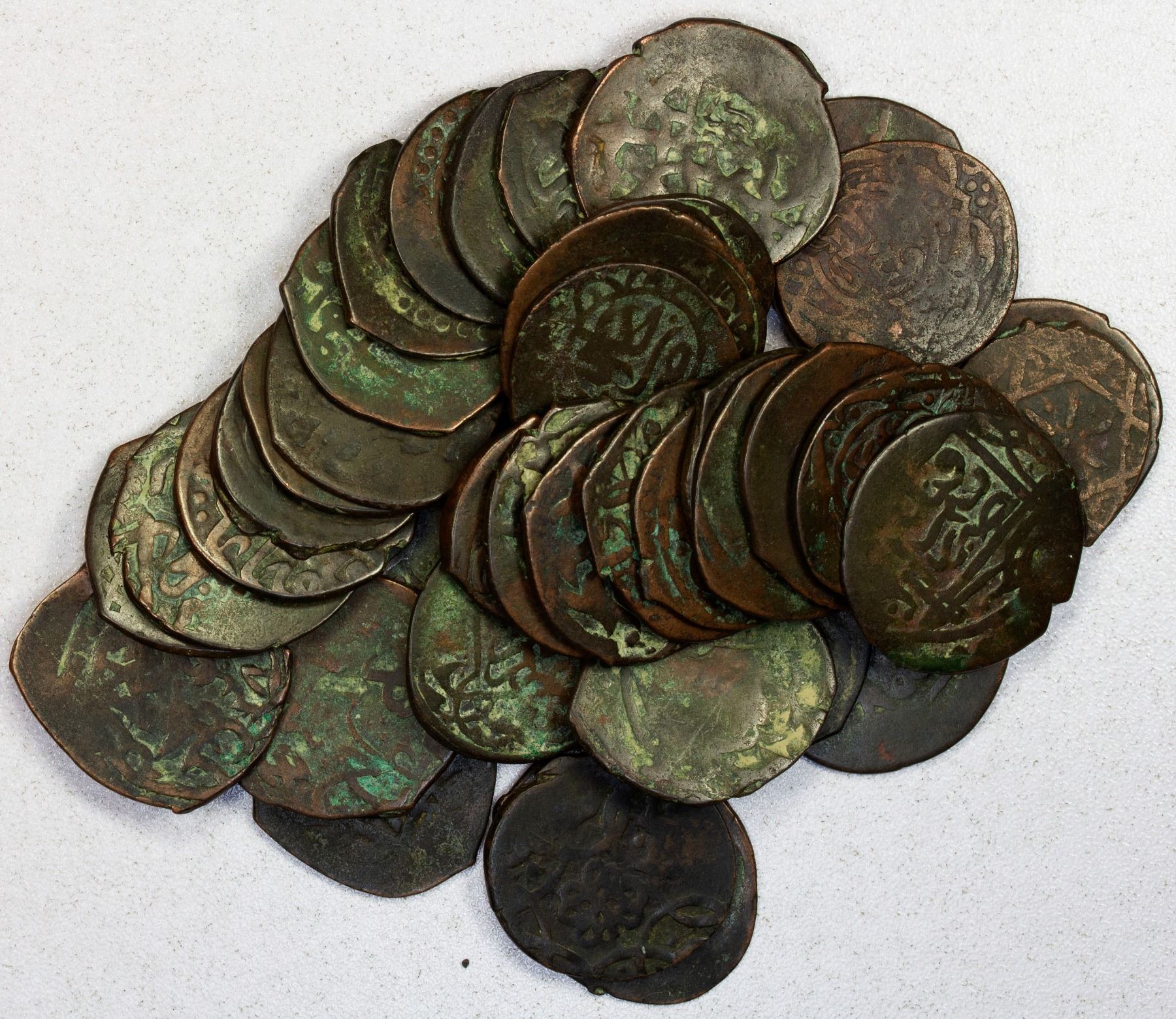 CIVIC COPPER: Central Asian Cities, LOT of 41 copper dangis, all from the late Timurid and early Shaybanid period (roughly AH 890s to 910s); many with legible mint name (Bukhara, Samarqand, and one each of Hisar and Tashkent) and many with legible date; a few also countermarked; average circulated grades, above average quality of strike; retail value $750, lot of 41 pieces.