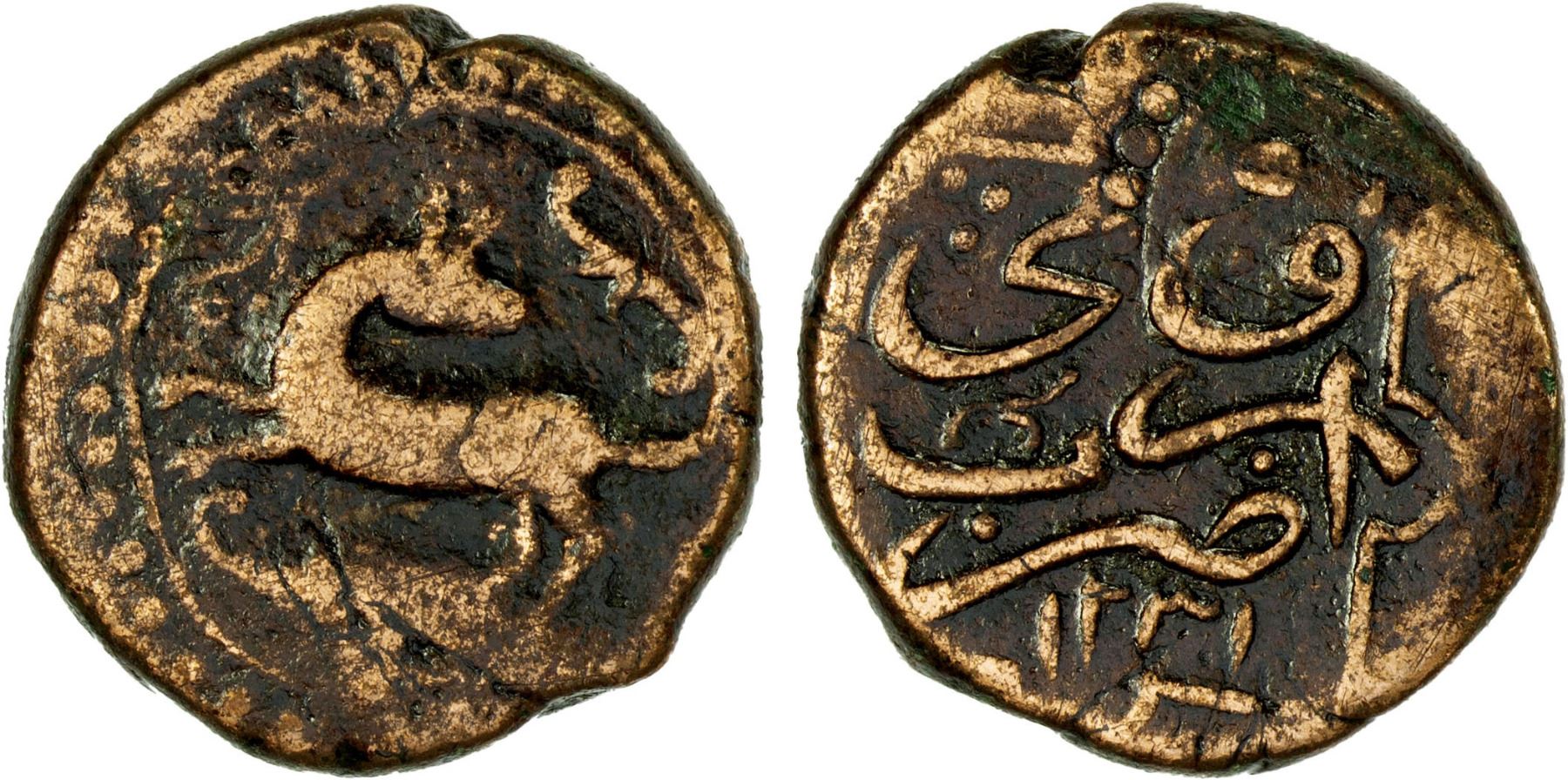 CIVIC COPPER: IRAN: AE falus (8.00g), Urumi, AH1231, A-3271, deer standing left, head turned back, About VF.