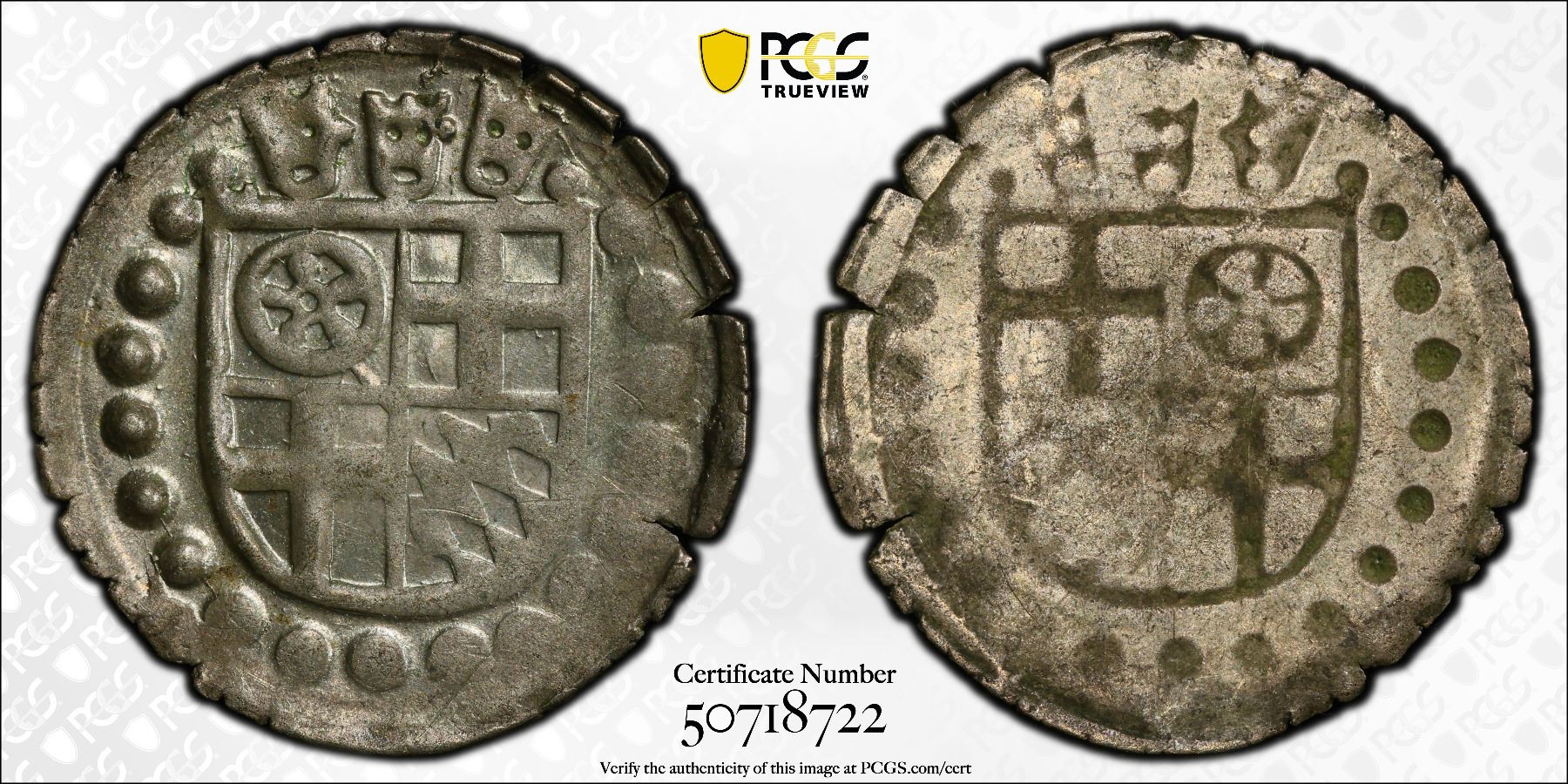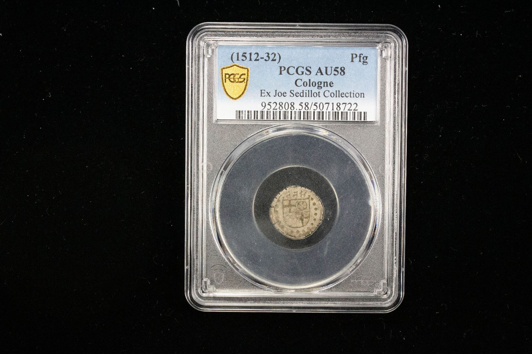 COLOGNE: Herman V of Wied, 1515-1547, AR heller, ND (1512-32), S&J-2839, 3 crowns above the 4-part shield Mainz Cologne Trier and Bavaria // incuse of obverse design, encapsulated backwards in PCGS holder, a well struck lustrous near mint state example, PCGS graded AU58, ex Joe Sedillot Collection. From 1512 to 1532, Cologne was a powerful Catholic stronghold resisting the rising tide of the Protestant Reformation. Under Archbishop Hermann of Wied, it upheld religious orthodoxy, censored Protestant materials, and maintained its influence as both a spiritual center and wealthy imperial city within the Holy Roman Empire.