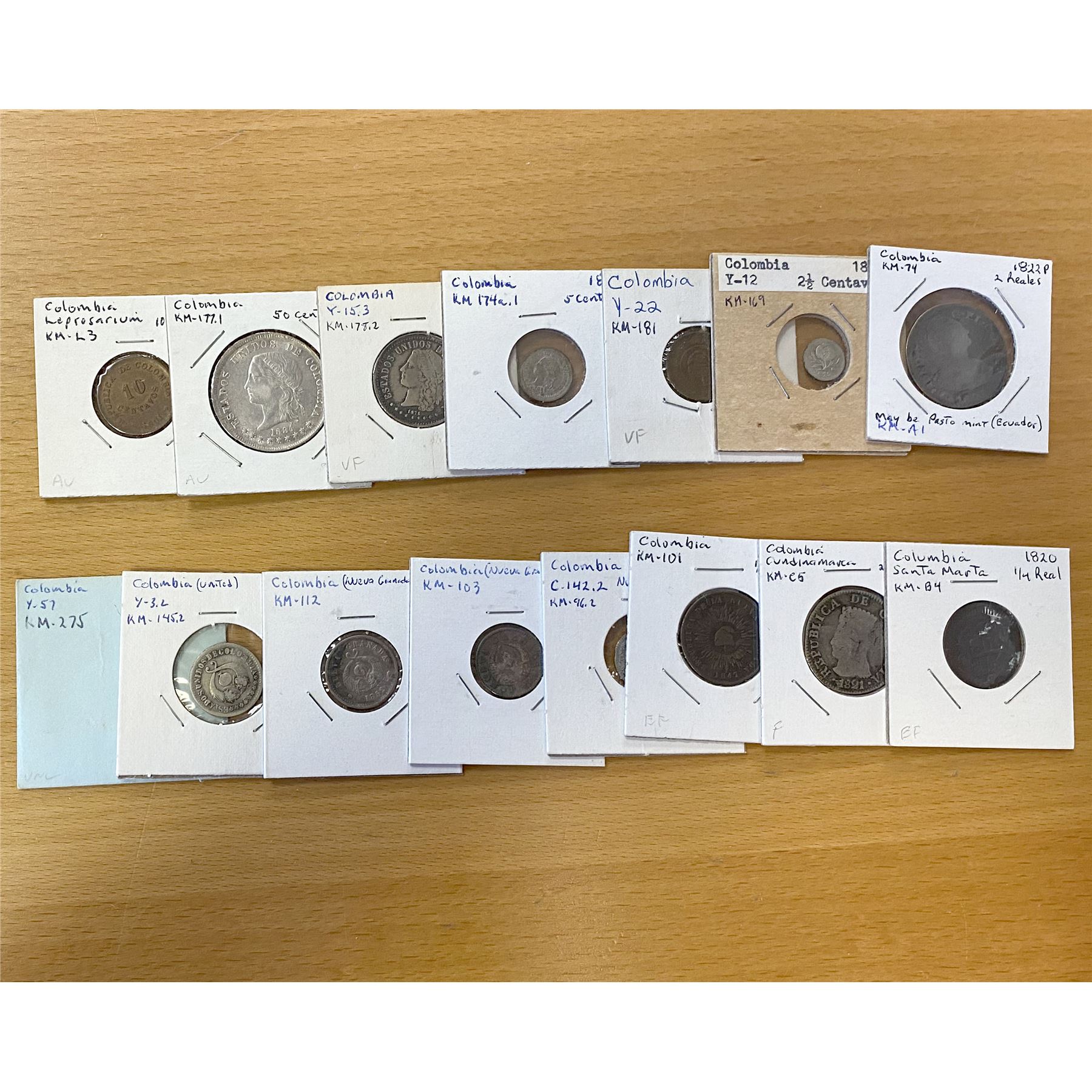 COLOMBIA: LOT of 15 coins, including Colombia/Ecuador (1 pc, 1822 Pasto 2 reales); Santa Marta (1), Cundinamarca (1), Nueva Granada (4), United States decimo series (1), United States centavos series (6), and Leprosarium issue (1); above average grades, and one unc, in consignor's 2x2 holders, viewing recommended; retail value $650, lot of 15 pieces, ex Joe Sedillot Collection.