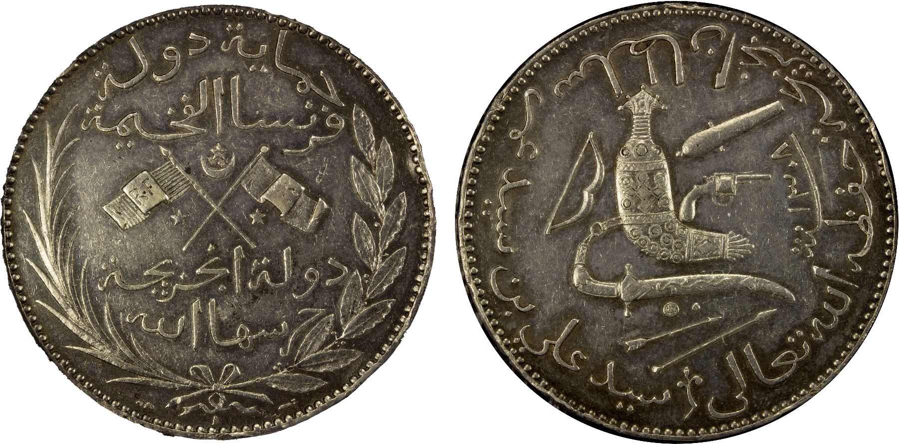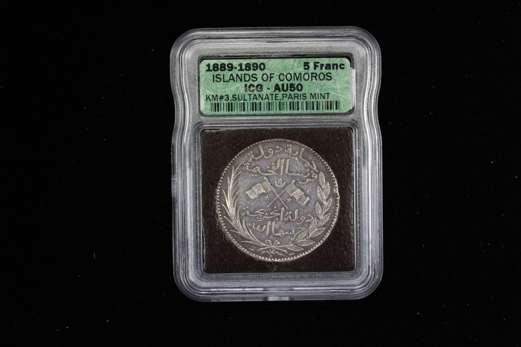 COMOROS: Said Ali b. Said Omar, 1886-1912, AR 5 francs, AH1308, KM-3, Dav-9, struck at the Paris Mint, crossed flags of France & the Comoros // multiple weapons gathered in the center: Jambiya, cannon, pistol, scimitar, bow and arrow, carefully engraved Arabic legends on either side, ICG graded AU50.