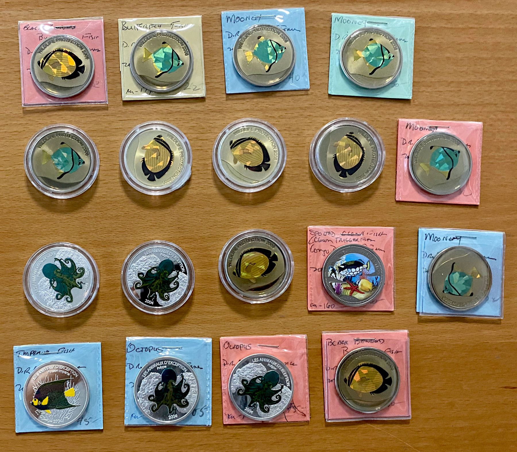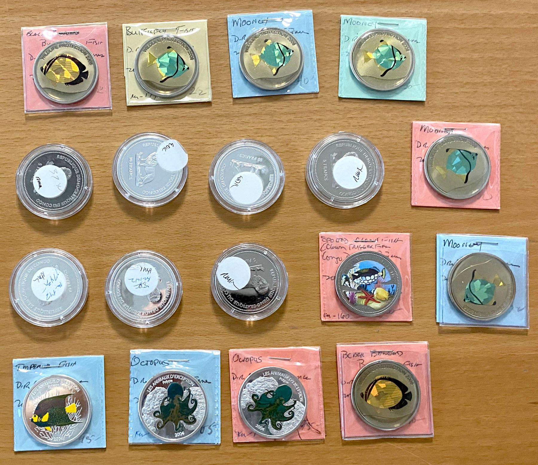 CONGO (DEMOCRATIC REPUBLIC): LOT of 18 coins, including Fish and Octopus coins, all multicolored, some with holograms; all in proof, some in silver, in consignor's 2x2 holders and capsules, viewing recommended; retail value $600, lot of 18 coins.