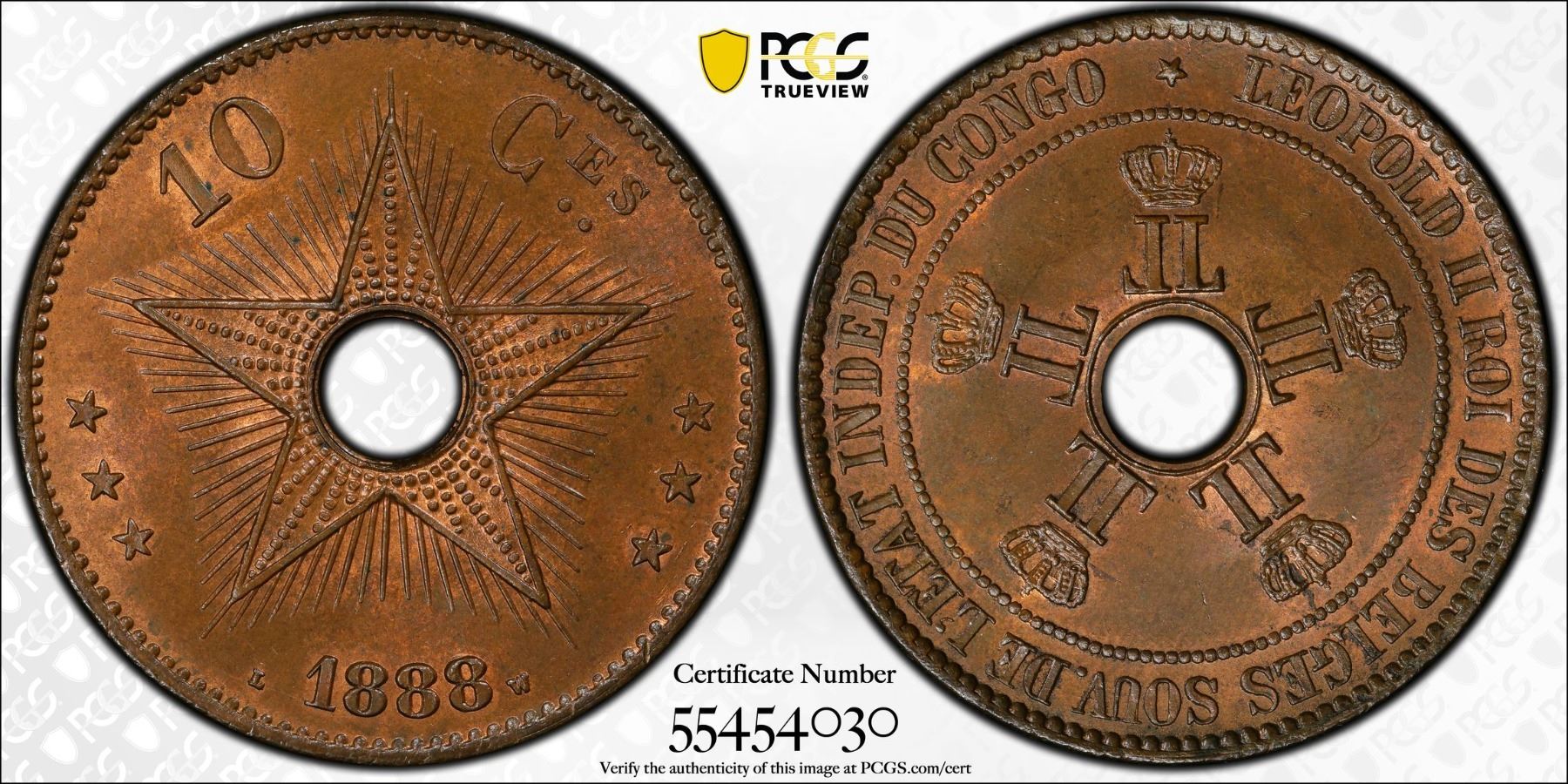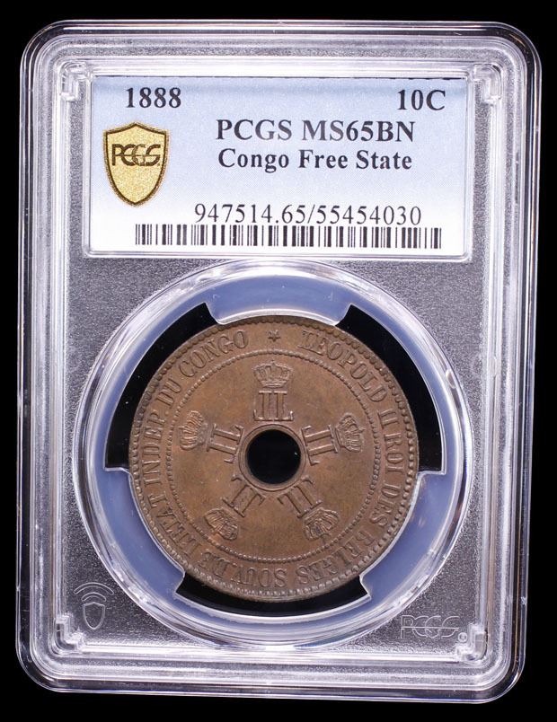 CONGO FREE STATE: Leopold II, 1885-1909, AE 10 centimes, 1888, PCGS MS65 BN
