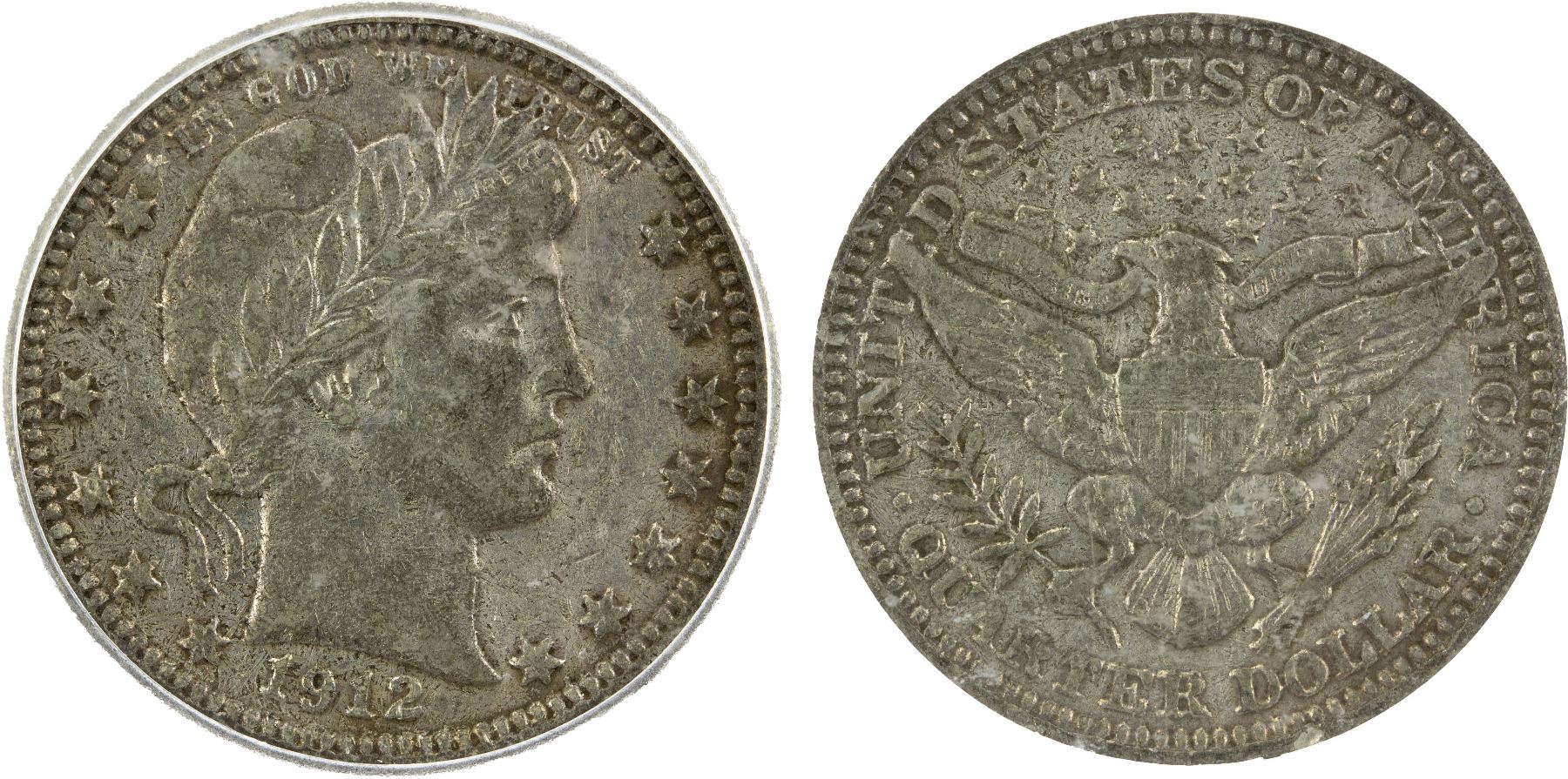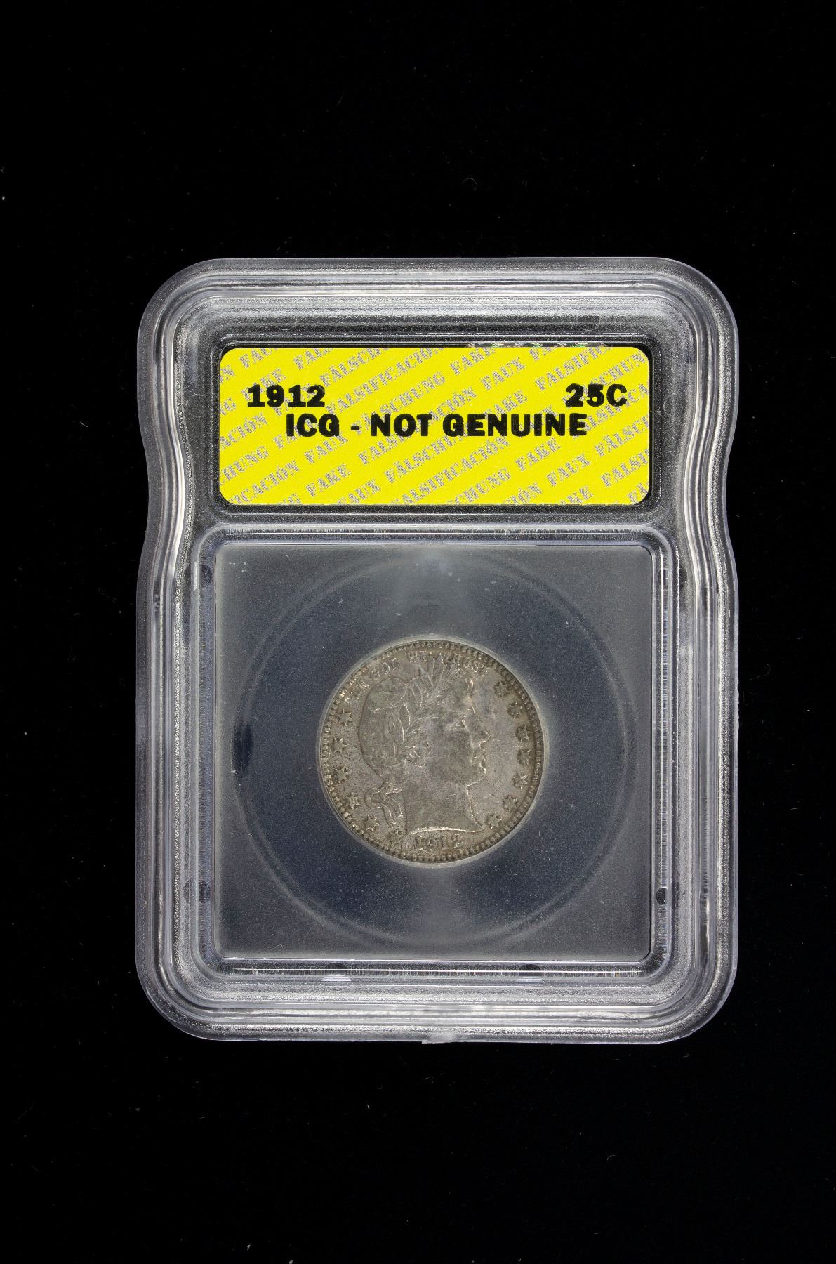 CONTEMPORARY OR LATER COUNTERFEITS: UNITED STATES: Barber quarter, 1912, as KM-114, contemporary or later counterfeit in unknown silver content, ICG Not Genuine holder, VF.