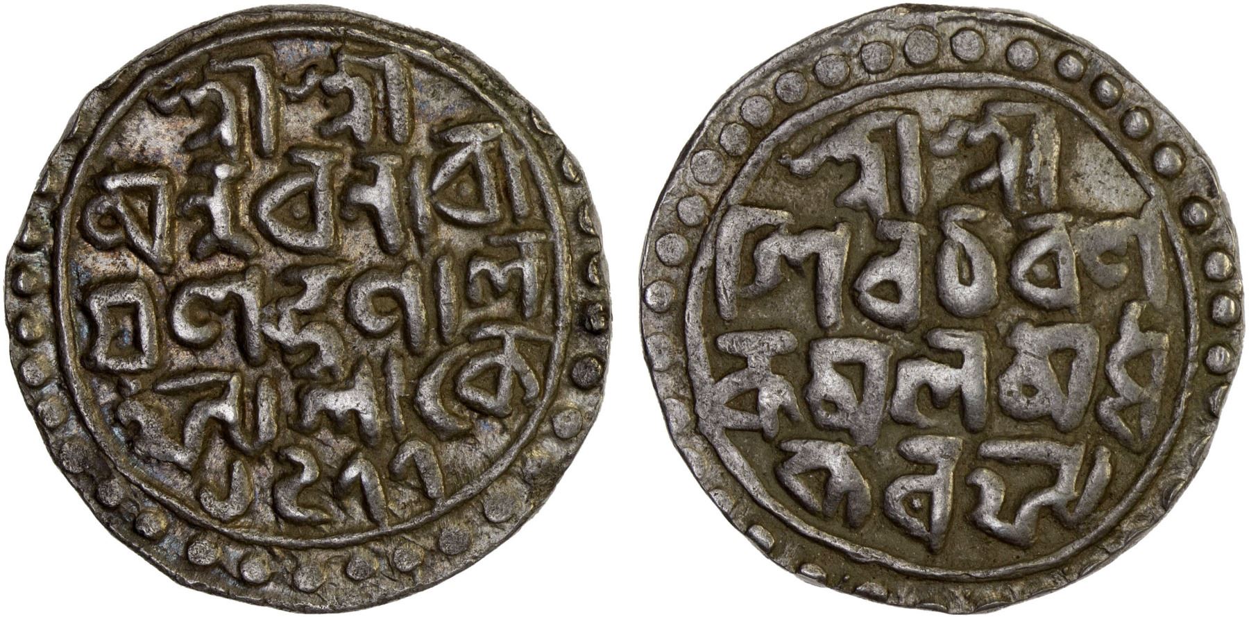 COOCH BEHAR: Nara Narayan, 1555-1587, AR rupee (10.42g), SE1477 (1555), KM-34.2, narrow flan type, accompanied by collector's information card, VF, ex Anton Holt Collection.