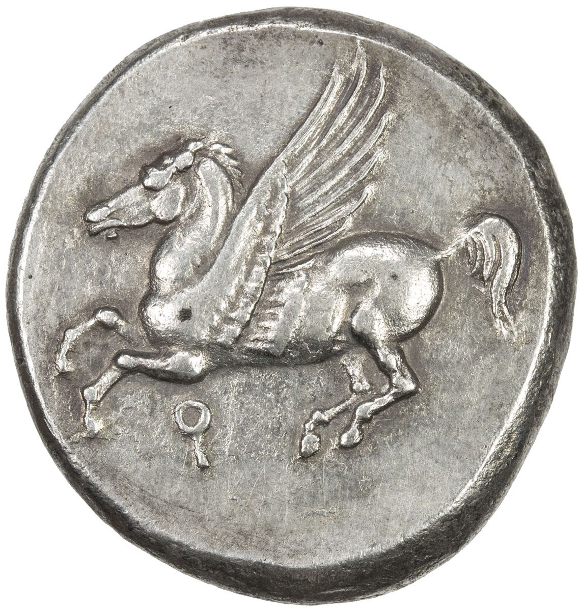 CORINTH: AR stater (8.56g), BCD Corinth-103; Pegasi-430, struck ca 345-307 BC, head of Athena left, wearing Corinthian helmet with laurel wreath, A below chin, cornucopia behind head with two ears of grain // Pegasus flying left, qoppa below, lightly toned with slight traces of porosity, a gorgeous coin of fine style and perfect centering, EF.