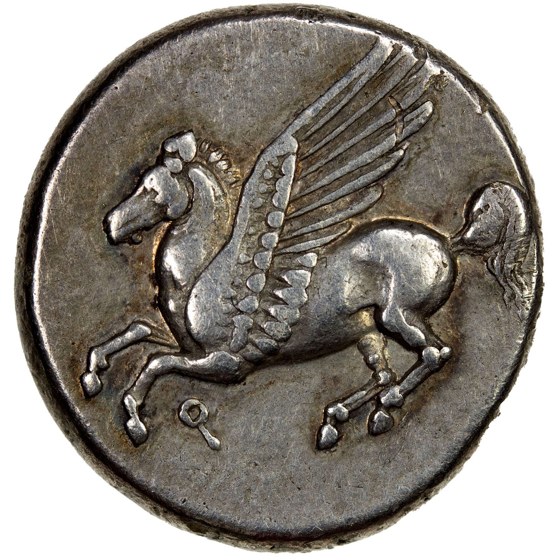 CORINTHIA: Corinth, AR stater (8.58g), ca. 345-285 BC, Ravel-1050, HGC-4/1848, Pegasos flying left, qoppa below // helmeted head of Athena left, and trophy behind, well-centered strike, lightly toned with gold and blue highlights, Choice VF.