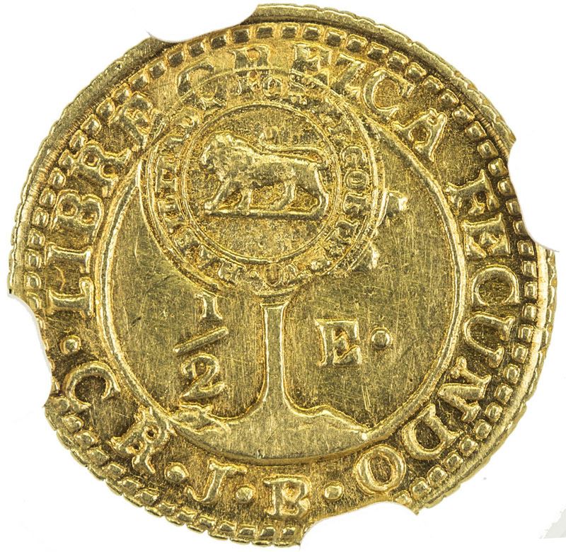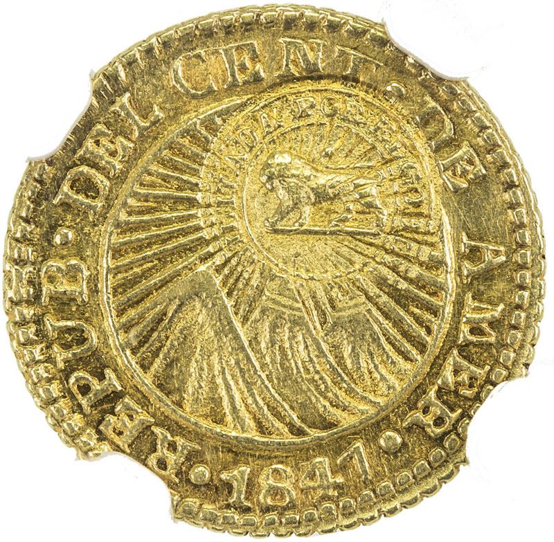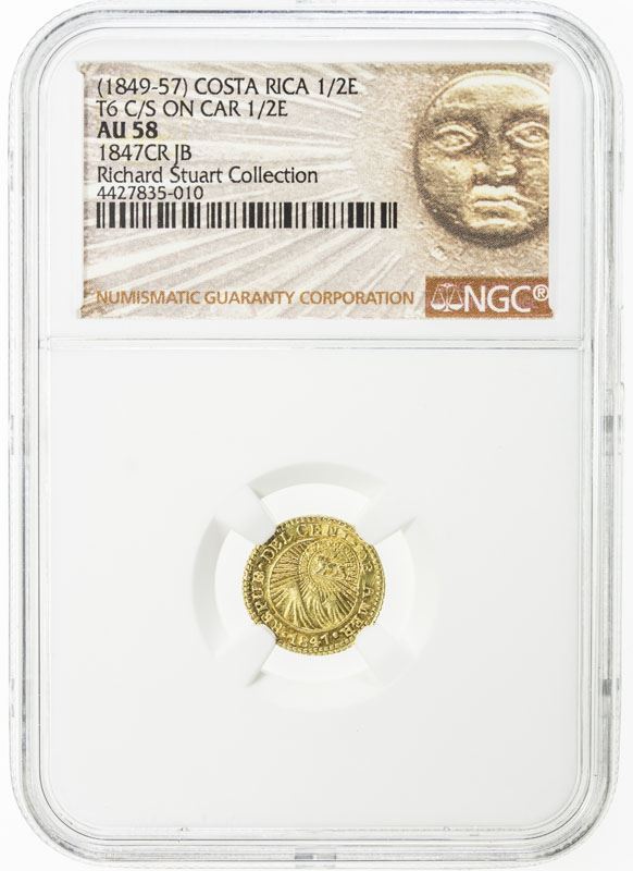COSTA RICA: AV ½ escudo, ND (1849-57), KM-80, Fr-5a, Type VII counterstamp on 1847CR-JB Costa Rica ½ escudo (KM-13.1), boldly struck counterstamp and host coin, NGC graded AU58, ex Richard Stuart Collection.