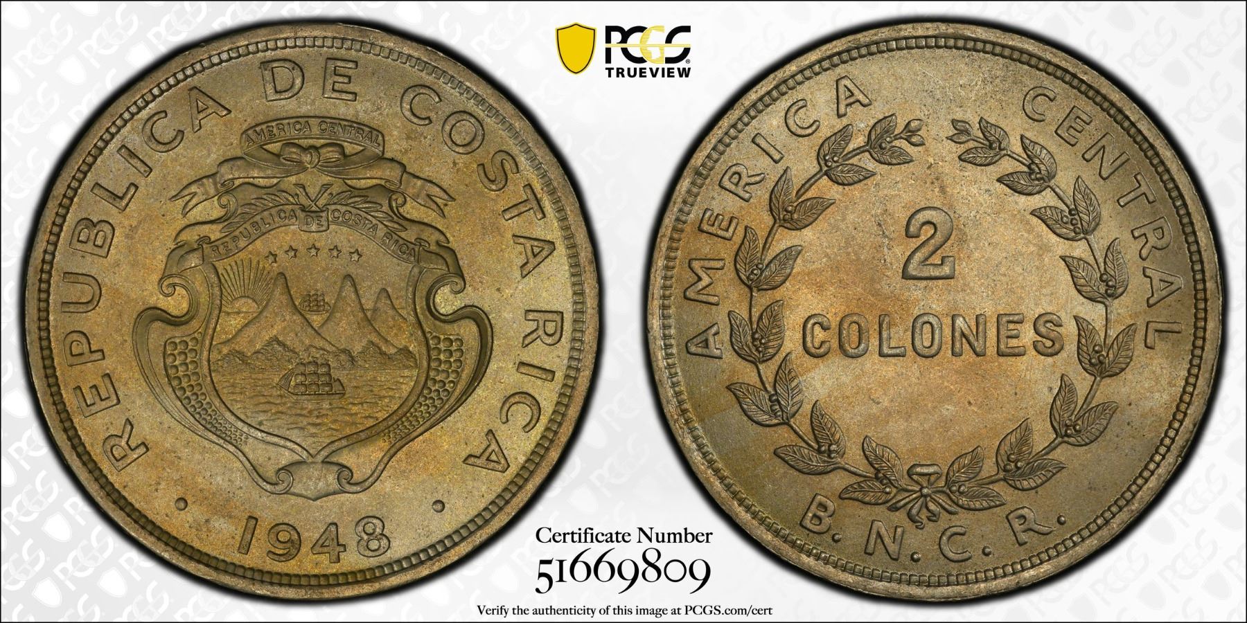 COSTA RICA: Republic, 2 colones, 1948, KM-183, Y-62, a superb lustrous example! PCGS graded MS65, ex Almer H. Orr III Collection.