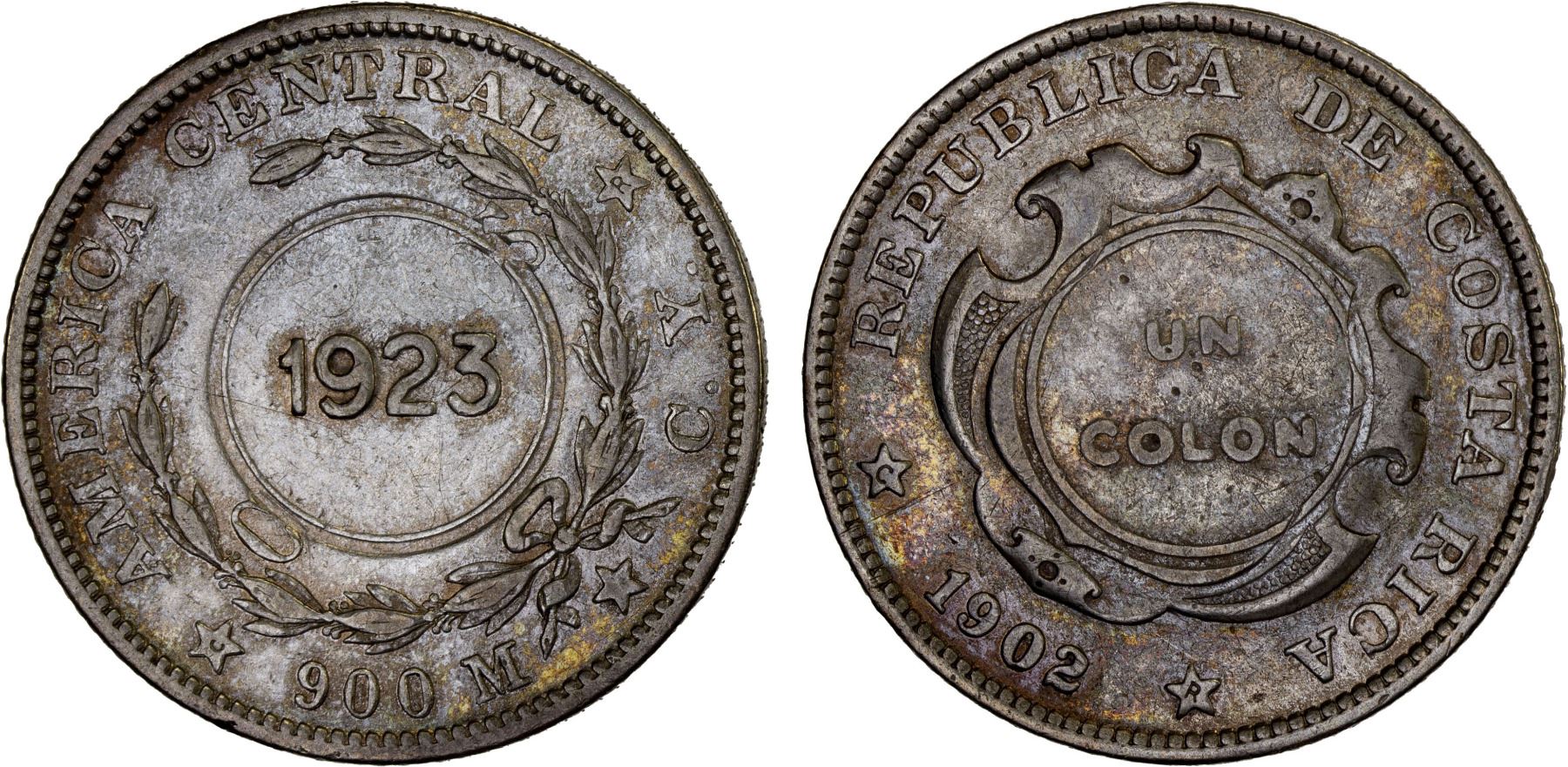COSTA RICA: Republic, AR colón, 1923, KM-164, countermark type IX on 1902 AR 50 centimos, host assayer CY, light hairlines on obverse, XF.
