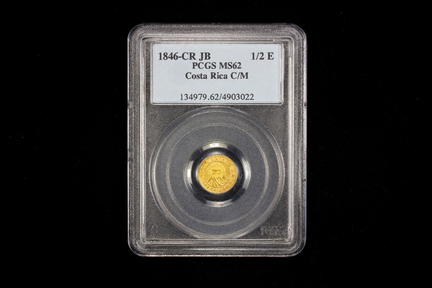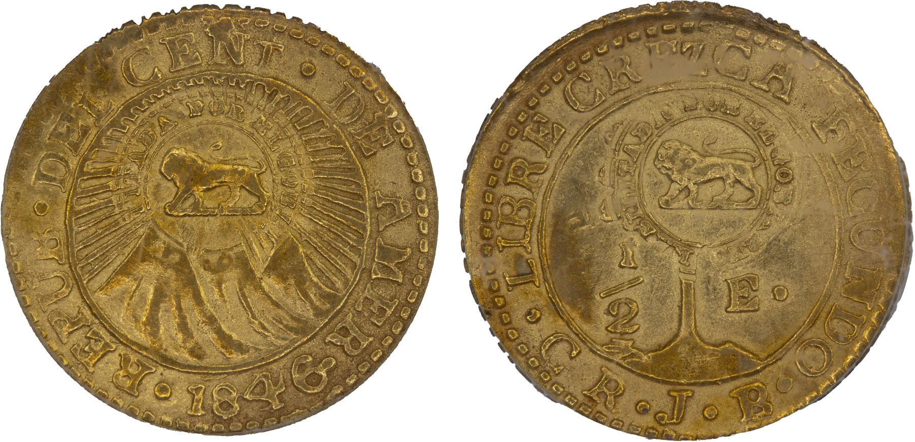 COSTA RICA: Republic, AV 1/2 escudo, ND (1849-57), KM-80, Fr-5a, type VII countermark on both sides of 1846-CR JB Central American Republic 1/2 escudo (KM-13.1), better date of host coin, PCGS graded MS62.