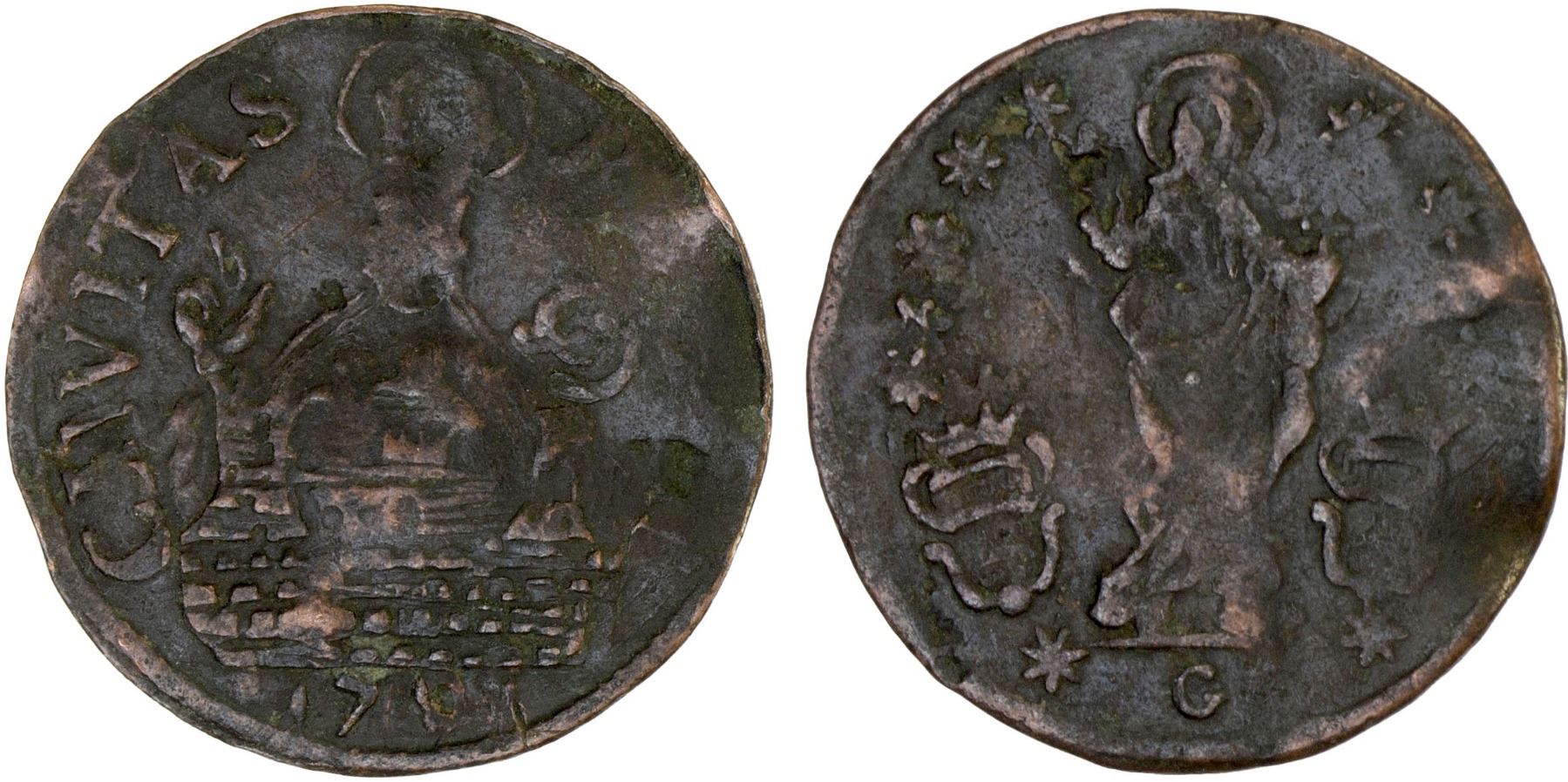 CROATIA: RAGUSA: Republic, AE soldo (1.28g), 1791, KM-6, RAGVSII CIVITAS around haloed bust of Saint Vlaho above wall of bricks // Christ flanked by designs within circle of stars, crudely struck as usual, crimped, VF.
