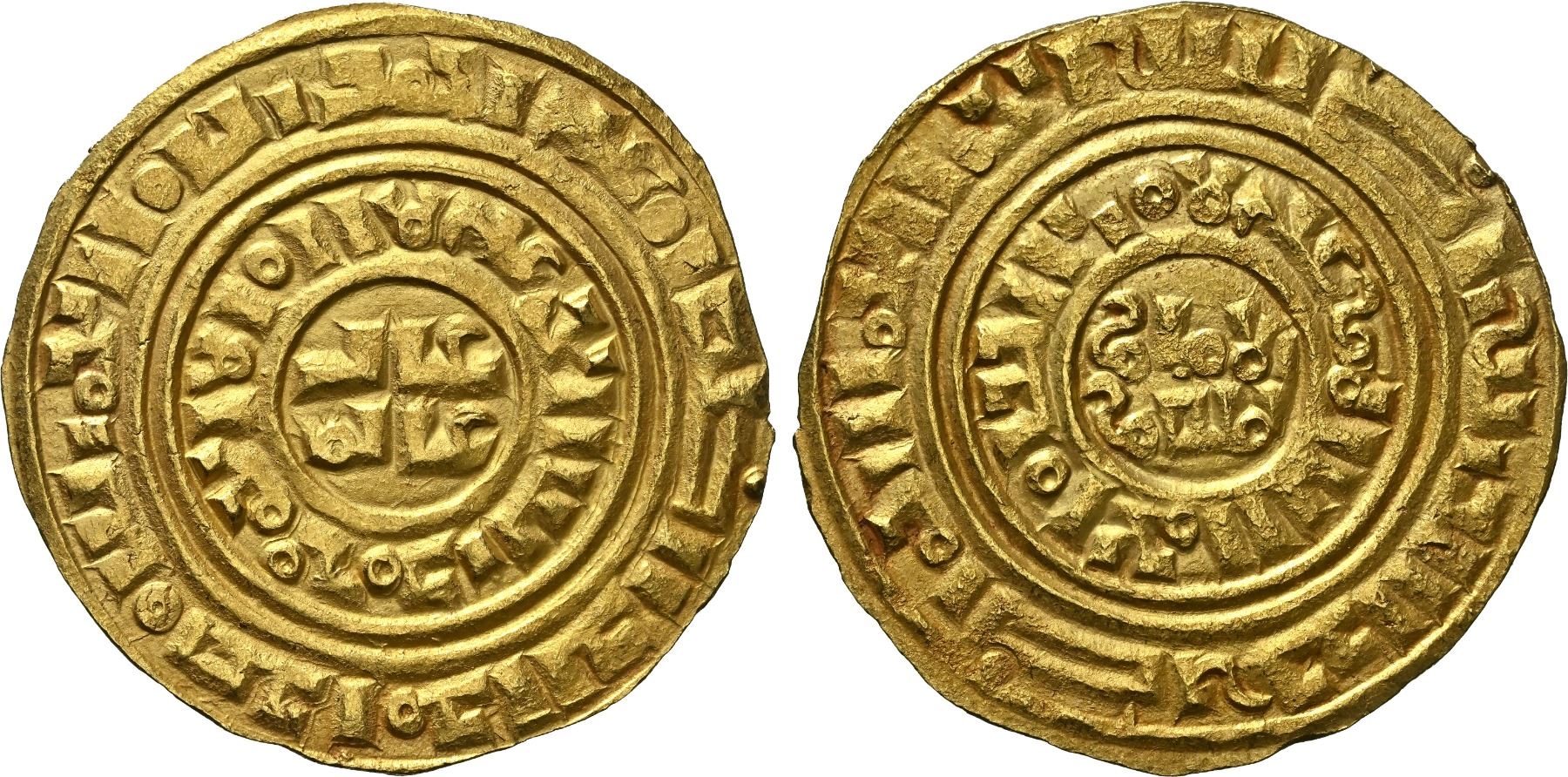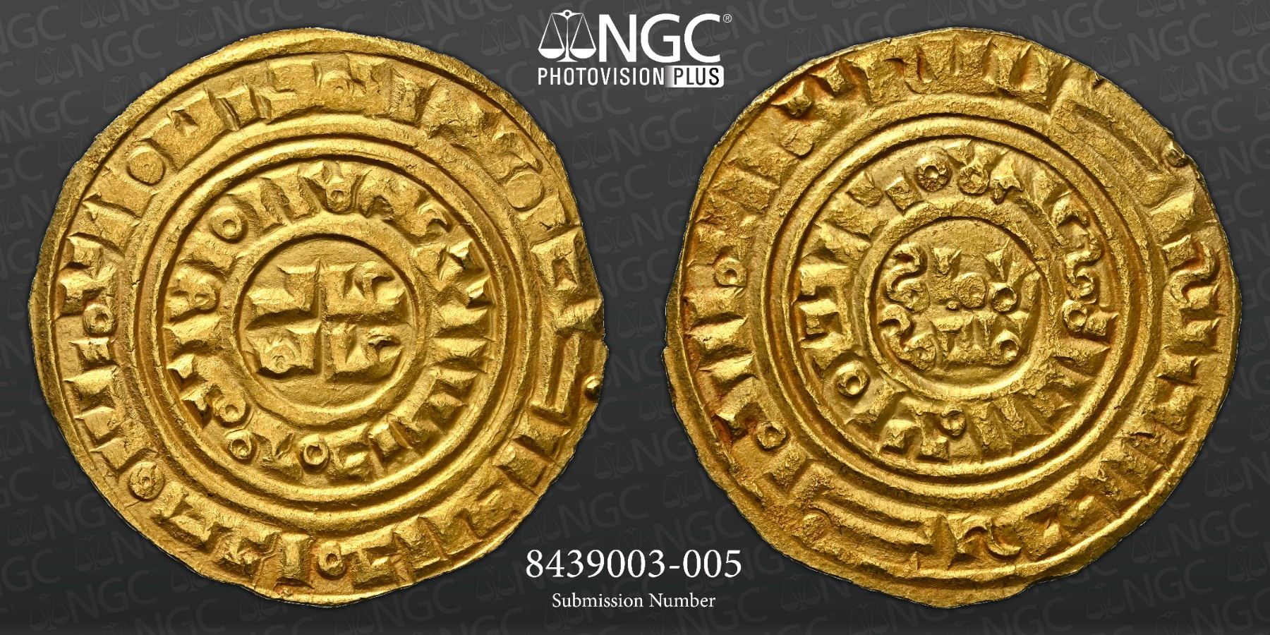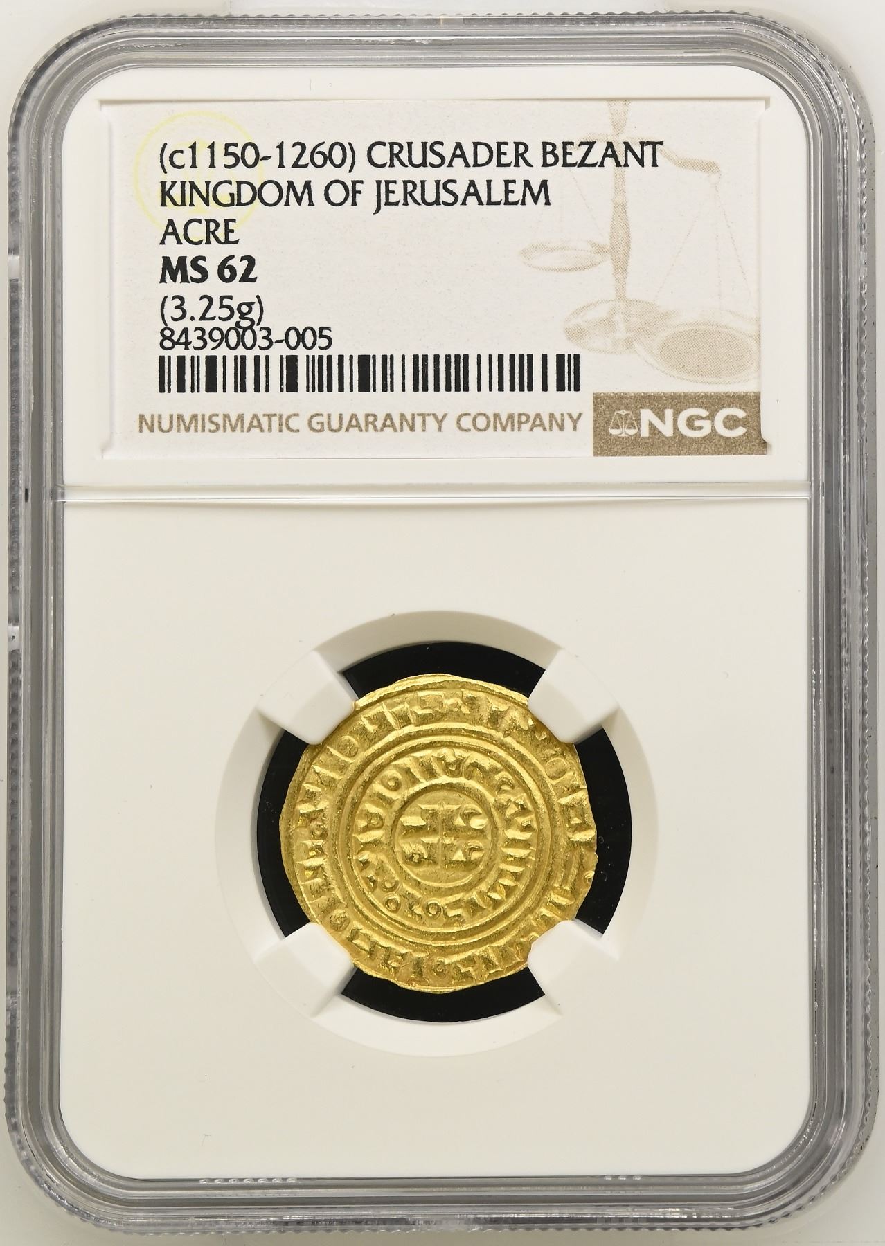 CRUSADER KINGDOMS: Kingdom of Jerusalem: Anonymous, ca. 1150-1260, AV bezant (3.25g), Acre, CCS-5, based on a dinar of the Fatimid Imam al-Mansur al-'Amir (1101-1130) with totally blundered Arabic and no pellets or other symbols in the central circles, a pleasing lustrous mint state example, NGC graded MS62.