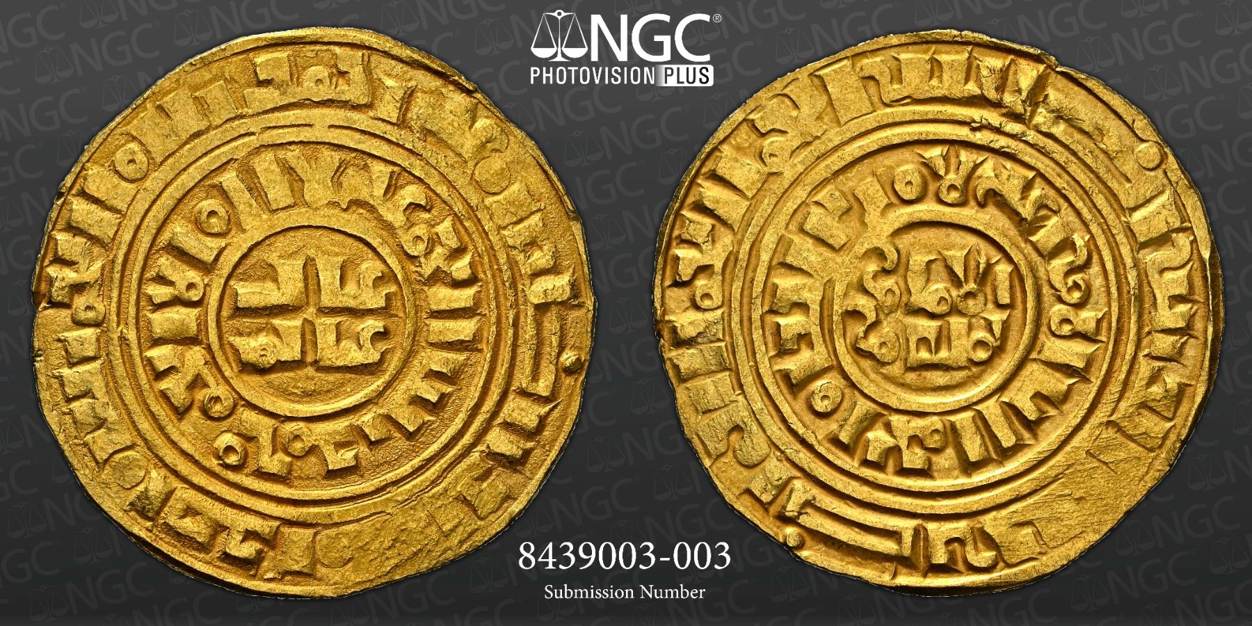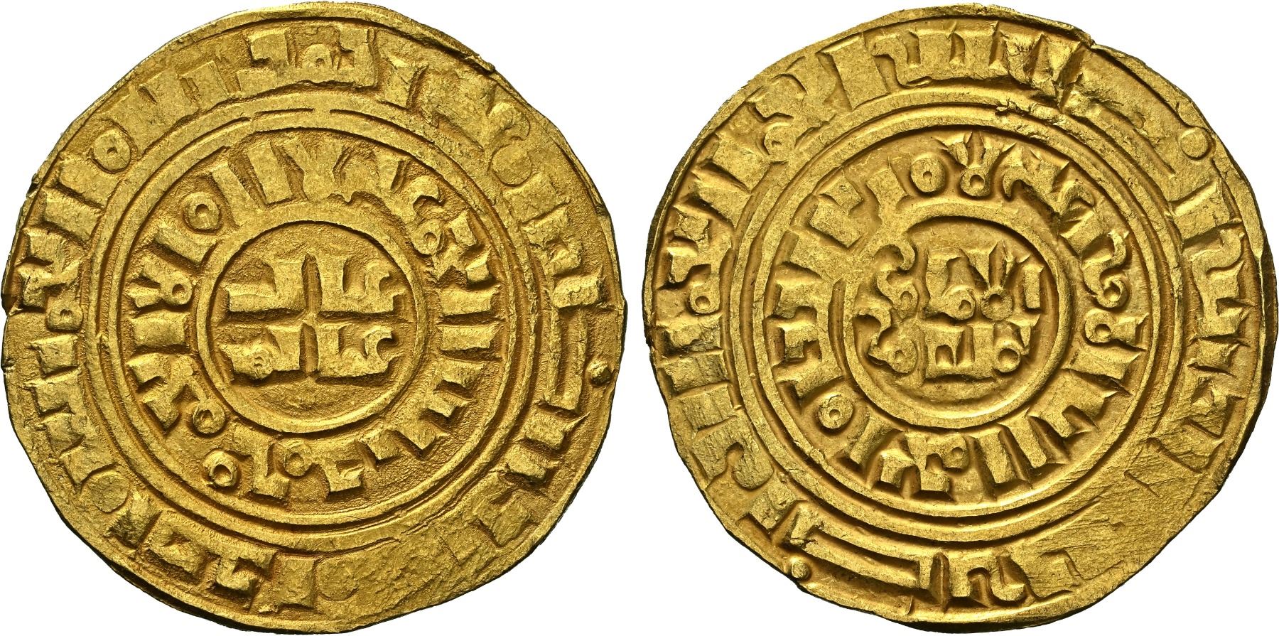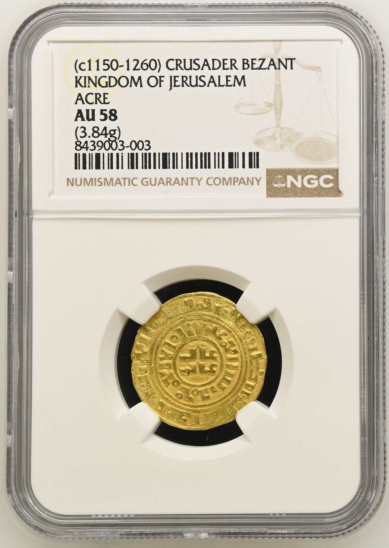 CRUSADER KINGDOMS: Kingdom of Jerusalem: Anonymous, ca. 1150-1260, AV bezant (3.84g), Acre, CCS-5, based on a dinar of the Fatimid Imam al-Mansur al-'Amir (1101-1130) with totally blundered Arabic and no pellets or other symbols in the central circles, an attractive nearly mint state example, NGC graded AU58.