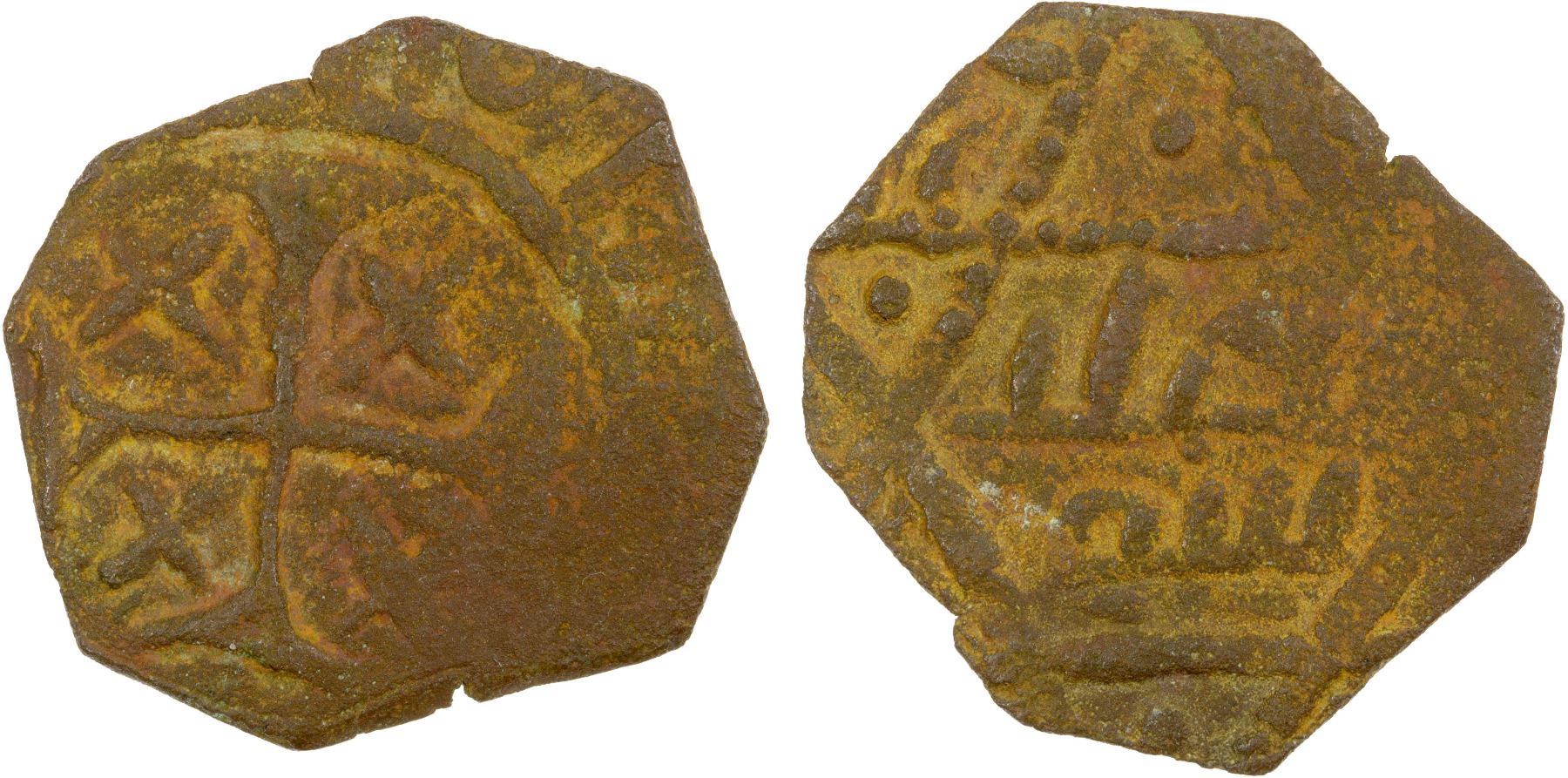 CRUSADERS: PRINCIPALITY OF ANTIOCH: Anonymous, ca. 1250-1268, AE follis (1.31g), CCS-130, cross pattée with "x" in each angle // crudely engraved Arabic interpreted as fals ankat, VF, RR.