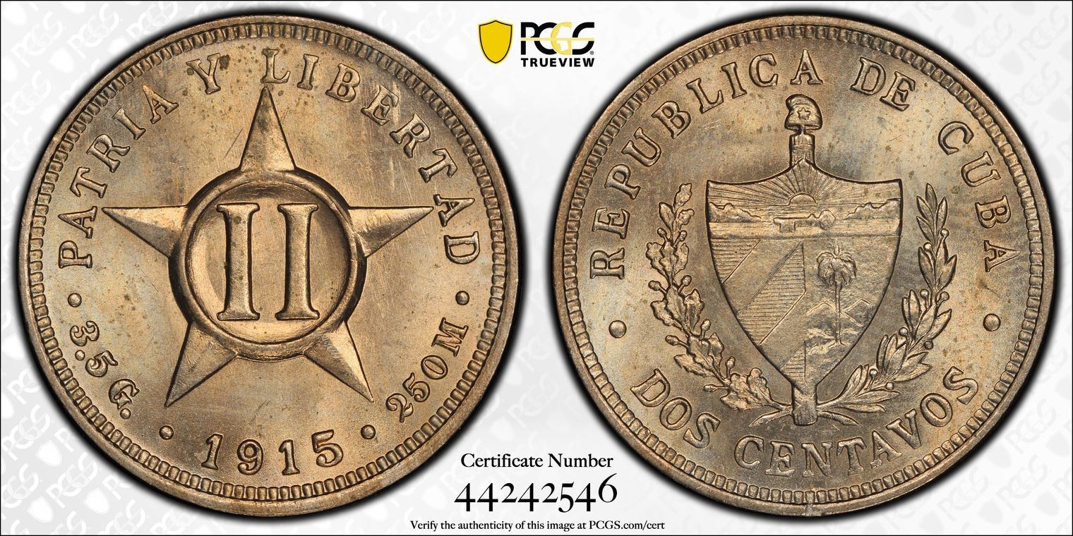 CUBA: Republic, 2 centavos, 1915, KM-A10, a wonderful example! PCGS graded MS64.