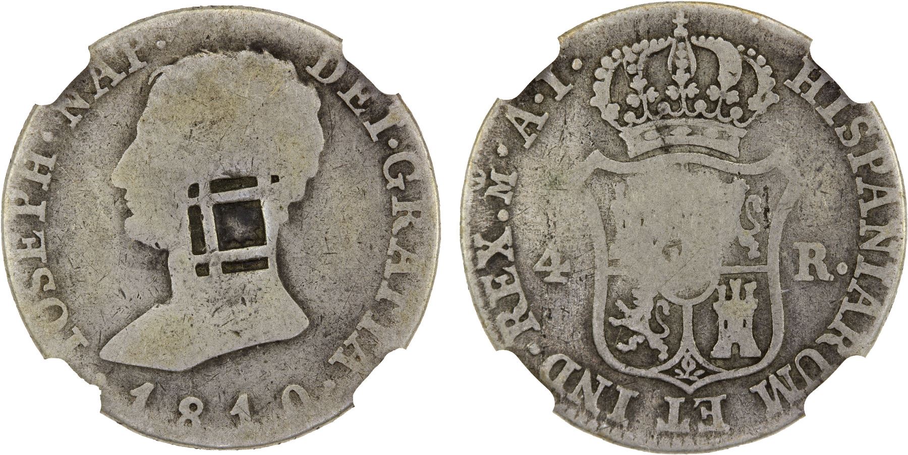 CUBA: AR 2 reales, ND (1841), KM-7, lattice countermark with star at center, on Spain 4 reales KM-540.1 type of Madrid 1810 in name of José Napoleon, assayer AI, NGC graded G4. By Spanish order in 1841, the lattice countermark was used in Trinidad, Santiago, and Puerto Principle.